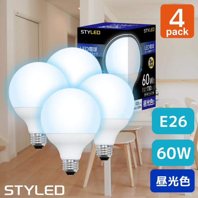 【4個セット・1個当たり599円】LED電球 E26口金 60W相当 ボール電球形 広配光タイプ 昼光色(730lm)