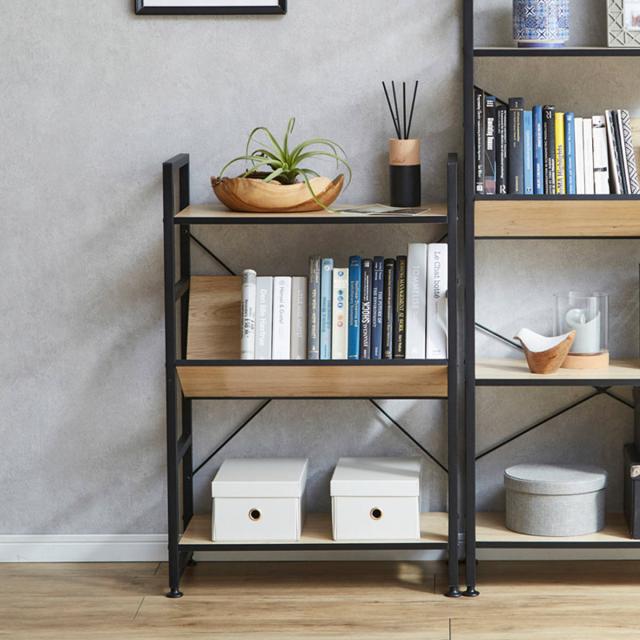 シンプルなデザインで空間に馴染みやすいシェルフです。古木風のリアルな木目を再現した3Dシートを使用しており、ブラックアイアンと組み合わさりモダンな風合いです。リビングや寝室、デスク横など様々な場所でお使いいただけます。