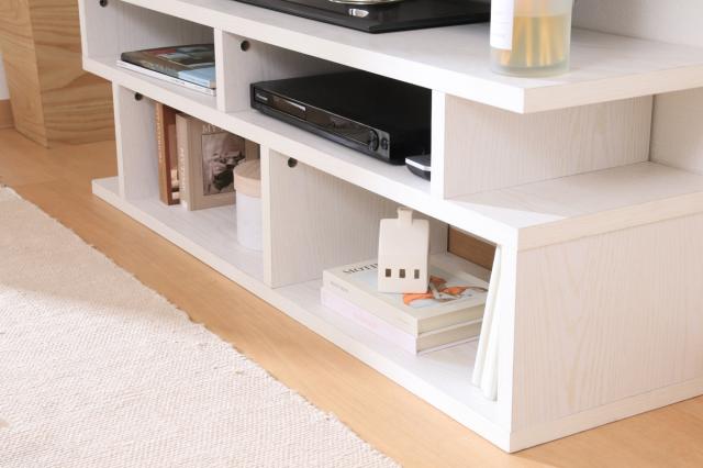 たっぷり収納できるのに圧迫感のないS字型テレビ台