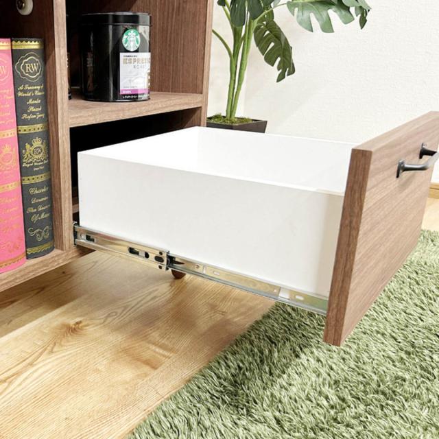 引出しはフルスライドレール仕様なので、奥の物まで見渡せて出し入れが楽ちんです。リビング周りの小物を収納しておくのにちょうど良いサイズ感の引出しです。