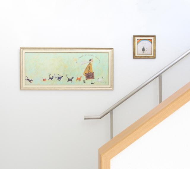 階段や廊下など、どこかもの寂しい空間も楽しく彩ります。移動するためだけの場所が素敵なインテリア空間に。階段の長い壁には、同じシリーズで数作品飾るのもおすすめです。