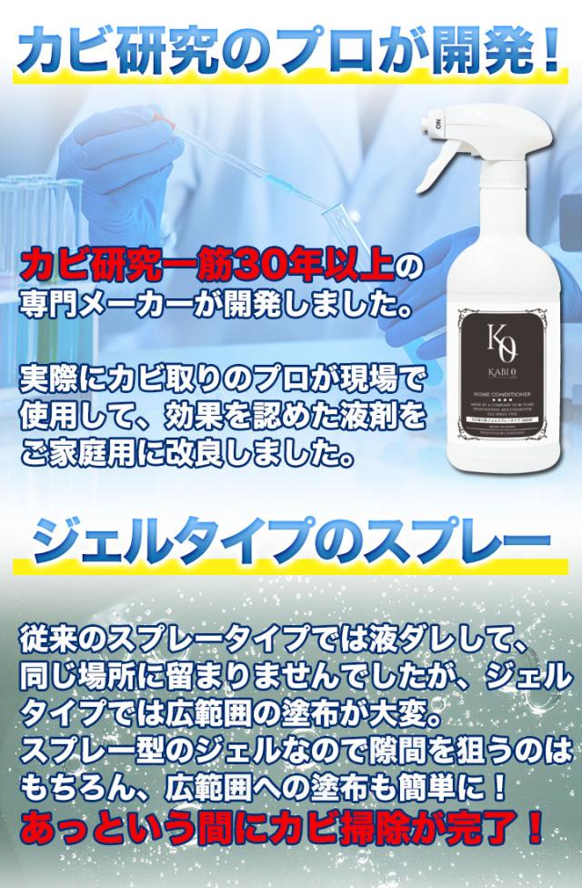 カビ研究一筋30年以上の専門メーカーが開発!実際にプロのカビ取り業者も使用している液剤を家庭用に改良いたしました!カビが気になる部分にスプレーし、10〜30分放置して水で流すだけ!カビの根元まで浸透し分解漂白します!従来のスプレー型カビ取り剤は壁に使用すると液ダレしてしまい、ジェル剤であっても塗りつける必要がある為に手間がかかりました。しかし、本商品はスプレー型のジェルなので吹き付けた所に留まりやすく深くカビにアプローチ!