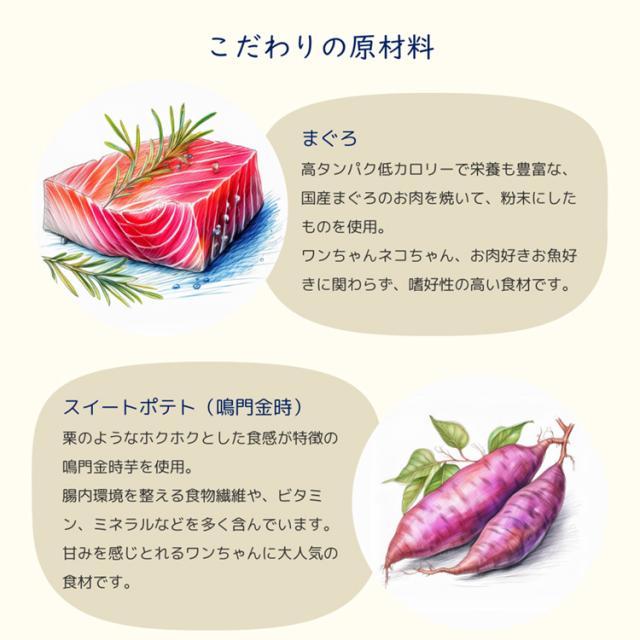 高タンパク低カロリーで栄養も豊富な、国産まぐろのお肉を焼いて、粉末にしたものを使用。