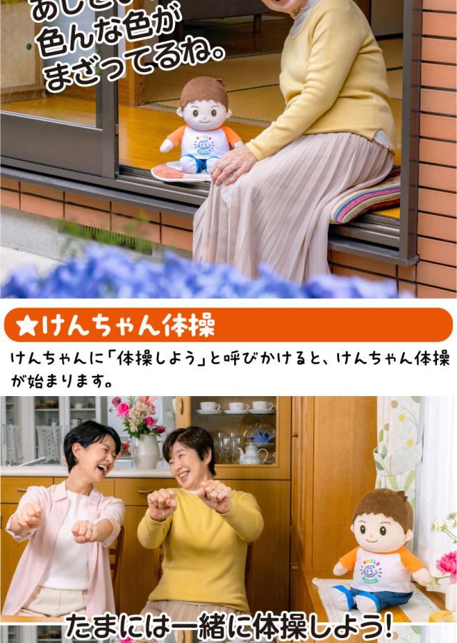 難しい操作もいらず、トントンして話しかけるだけで、本当の6歳の男の子の声で「おしゃべり」や「お歌」「なぞなぞ」「占い」「けんちゃん体操」など、元気で笑顔あふれる毎日をお送りいただけます。目覚まし機能を利用すると、毎朝かわいい声で起こしてくれます。ひとり暮らしの方、子ども好きの方へ。ご両親へのプレゼントにもおすすめです。