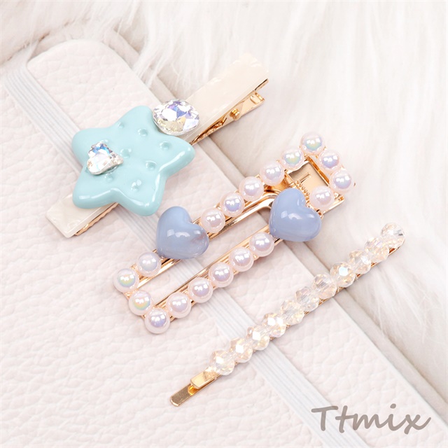 ヘアクリップ3点セット パールへアピン ハート 星 デコヘアクリップ 前髪クリップ 髪留め ブルーカラー