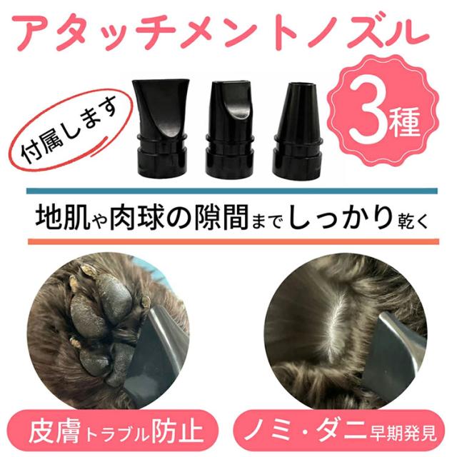 風量は、25m/s〜50m/s(ダイヤル式の無段階調整)。 最弱で家庭用ドライヤーの中風くらい、最強風でドライヤーの倍近く、アタッチメントを付けると肌が波打つくらいの強風です。 ※顔周りや肛門付近は弱風でご使用ください。 超強風のドライヤーがあれば、素早く水分を飛ばして皮膚まで乾燥出来ます。モフモフのわんちゃんでも、毛をかき分けて乾かすので皮膚トラブルも発見出来ます。 3種類の送風アタッチメントは、全体を乾かしたいとき、細かな部分を乾かしたいとき、ブローしたいときなど、シーンに応じて使い分けできます。 空気を吸うところにはフィルターがあるので毛が抜けるわんちゃんでも本体が故障することなく使用できます。 |