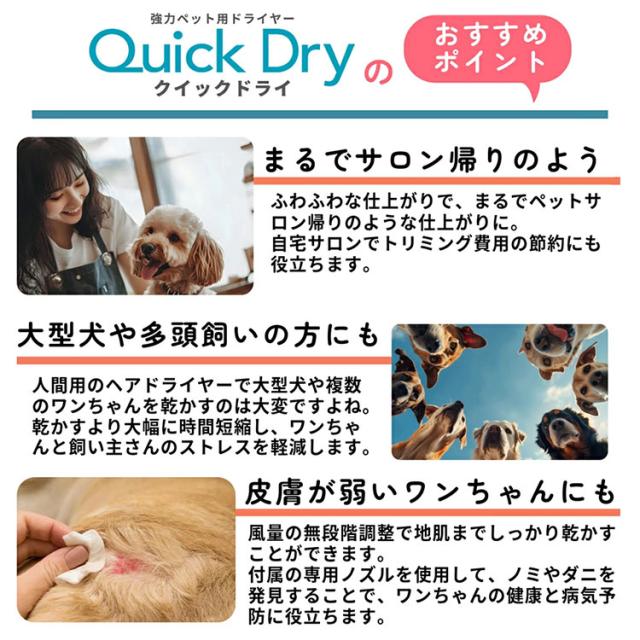 ■keyword:業務用ペットドライヤー/クイックドライ/QuickDry/Quick Dry/クイック ドライ/PSE適合/安心/安全/日本規格/ペットドライヤー/ペットヘアードライヤー/ドッグドライヤー/犬用ドライヤー/ペット用ドライヤー/風量調節/大風量/超強風/弱風/速乾/すぐに乾く/乾かす/ドライ/ブロー/温度調節/大型犬/中型犬/多頭飼い/人気/DogOne/ドッグワン/メーカー保証/ペット/トリミング/サロントリミングサロン/日本規格