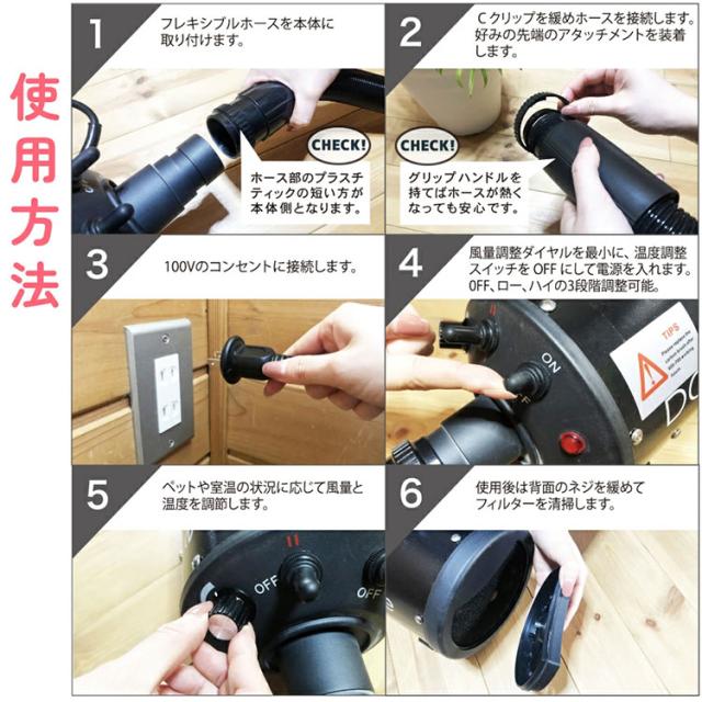 1.フレキシブルホースを取り付けます。Cクリップを緩めホースを接続します。お好みの先端のアタッチメントを装着します。 2.100Vのコンセントに接続します。 3.風速ダイヤルを最小に、音風スイッチをOFFにして電源を入れます。風速を調整します。 4.ペットや室温の状況に応じて温度を調節します。 5.使用後は背面のネジを緩めて清掃します。 (ドライヤーを廊下等に出して乾かすと毛を吸い込まずに清掃回数が減ります。屋内用なので本体を屋外には出して使用しないでください。) |