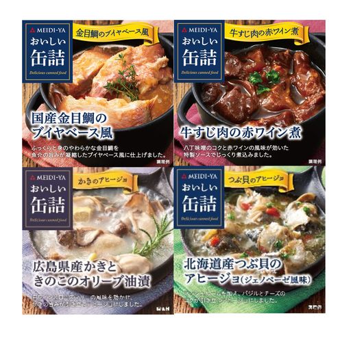 明治屋 お酒がすすむ おいしい缶詰 4種セット(国産金目鯛のブイヤベース風 1個,牛すじ肉の赤ワイン煮 1個,広島県産かきときのこのオリーブ油漬(白ワイン&ハーブ風味)