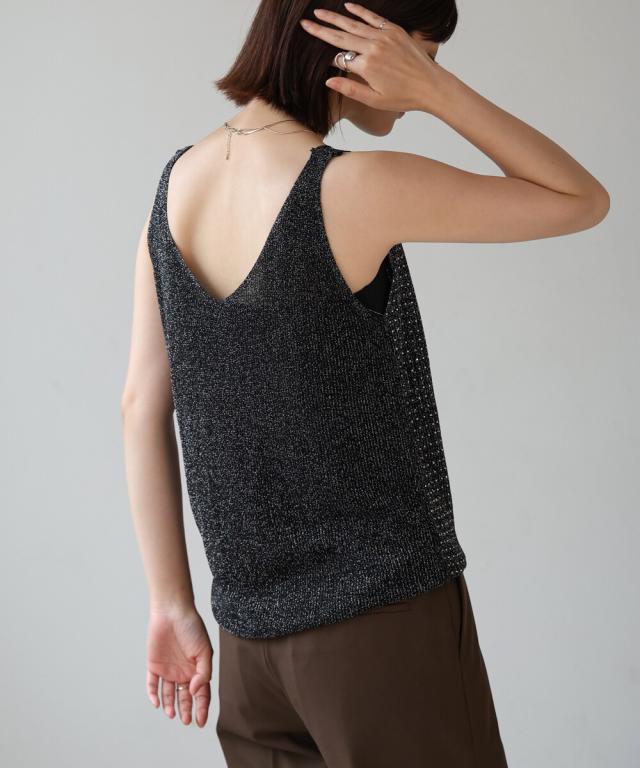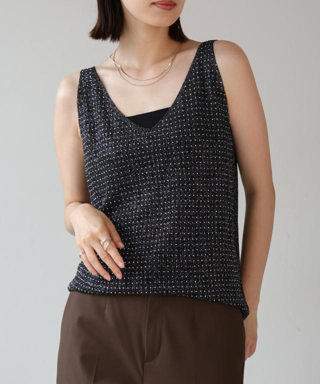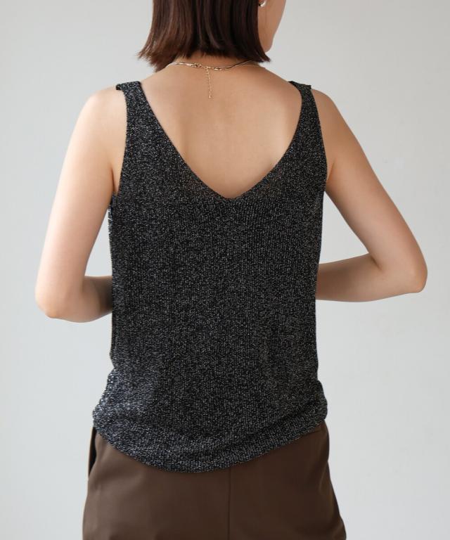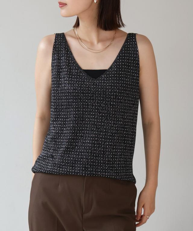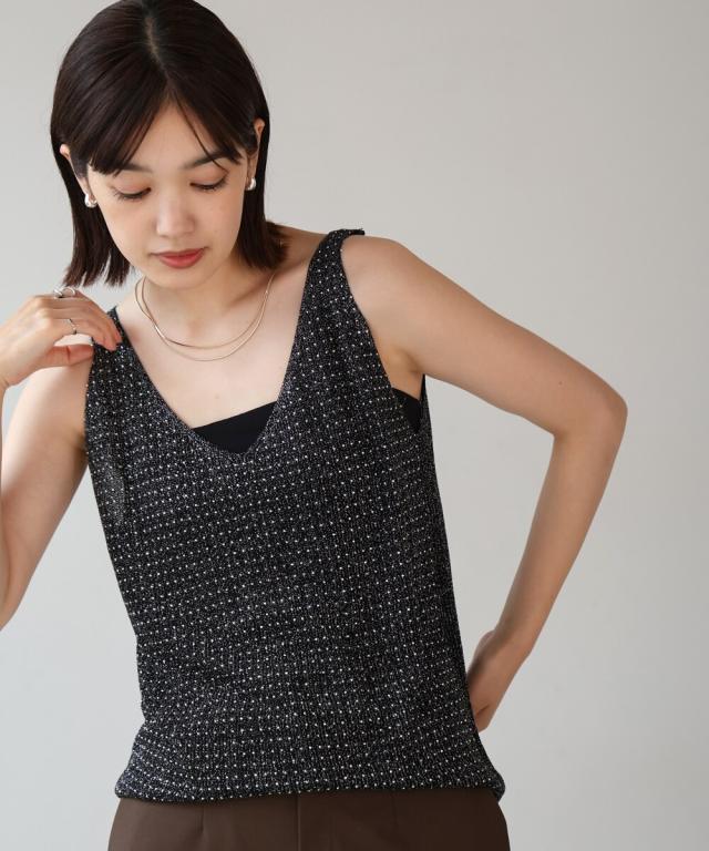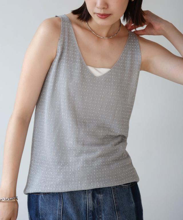 キラキラのビジューがラグジュアリーなタンクトップが登場です。深めに開いたVネックと背中開きがヘルシーな印象を与えます。ラメ糸が織り込まれたニット地に無数の極小ビジューが散りばめられ、360度どこから見ても華やかで主役級な1枚になりました。
