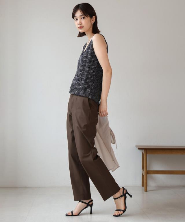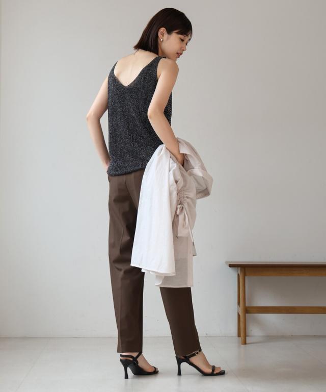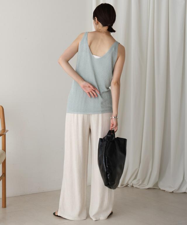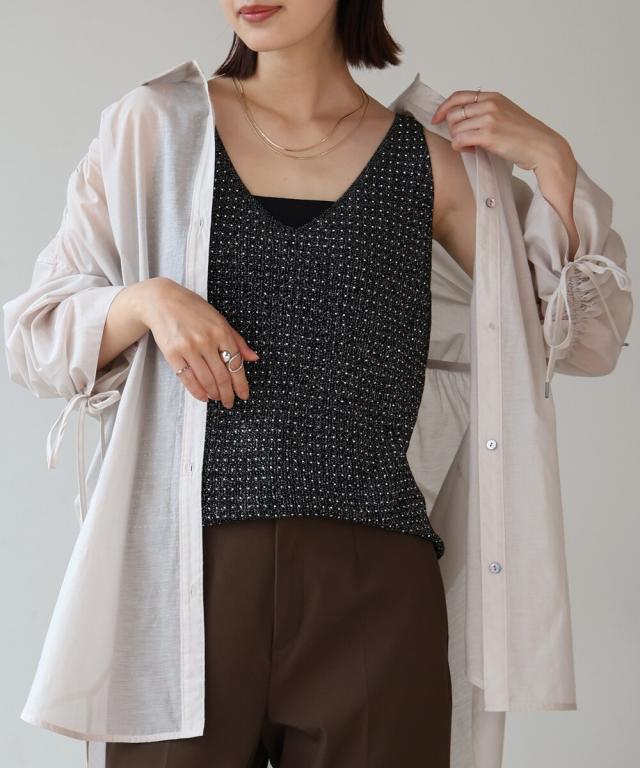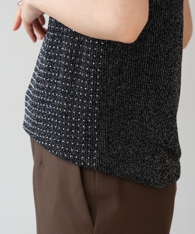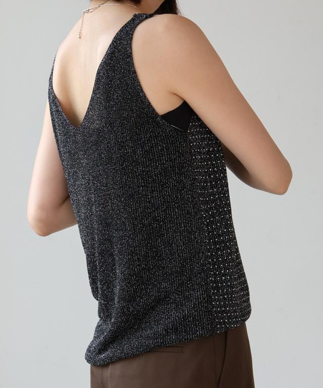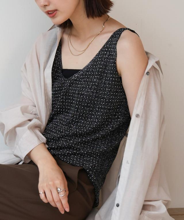 キラキラのビジューがラグジュアリーなタンクトップが登場です。深めに開いたVネックと背中開きがヘルシーな印象を与えます。ラメ糸が織り込まれたニット地に無数の極小ビジューが散りばめられ、360度どこから見ても華やかで主役級な1枚になりました。