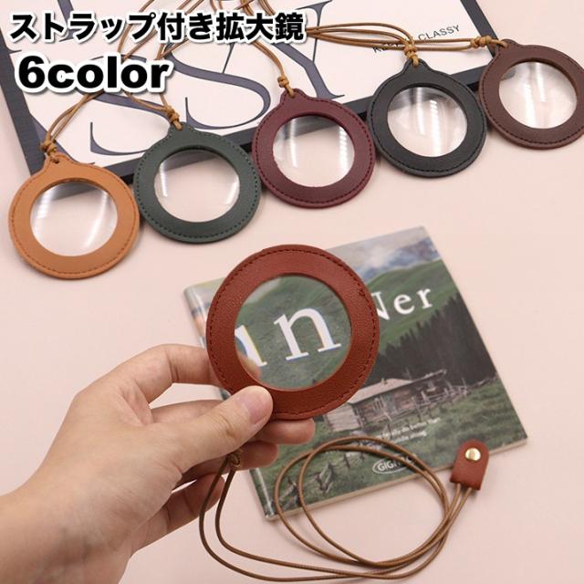 拡大鏡 ルーペ 虫眼鏡 3倍 ストラップ付き 首掛け 円形 丸型 丸形 ラウンド レザー調 フェイクレザー シンプル 持ち運び