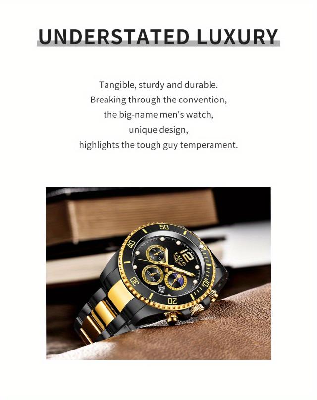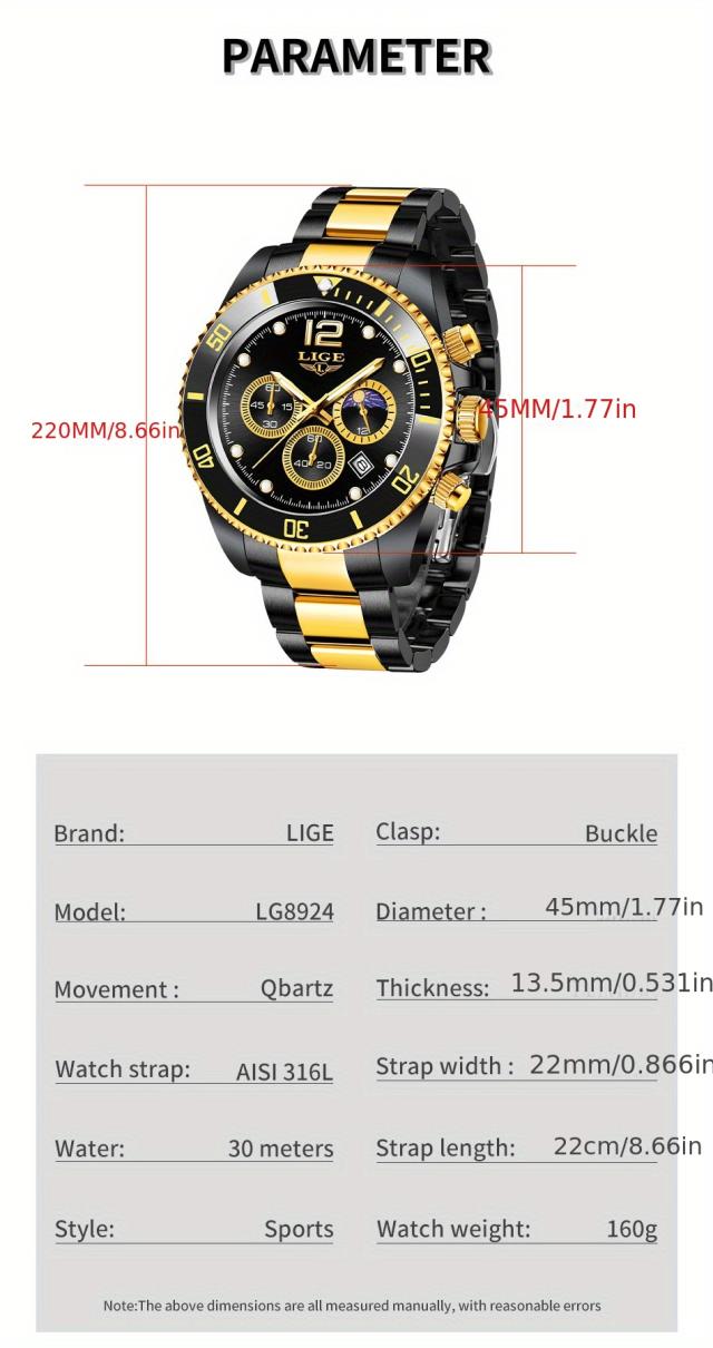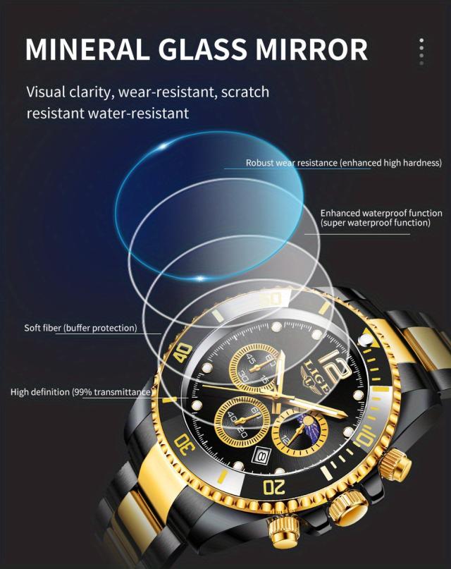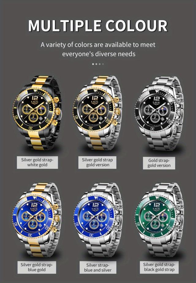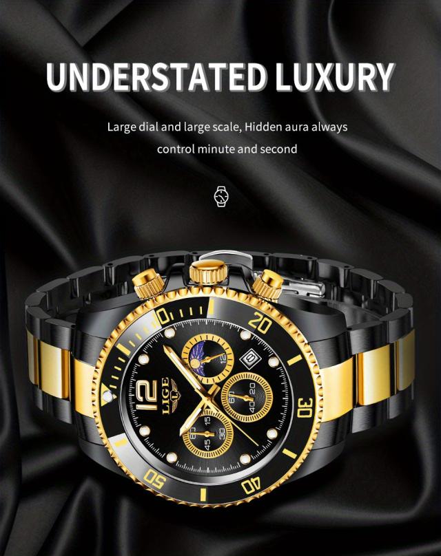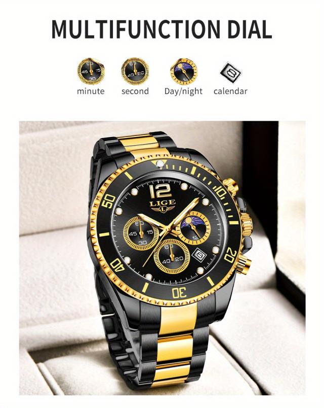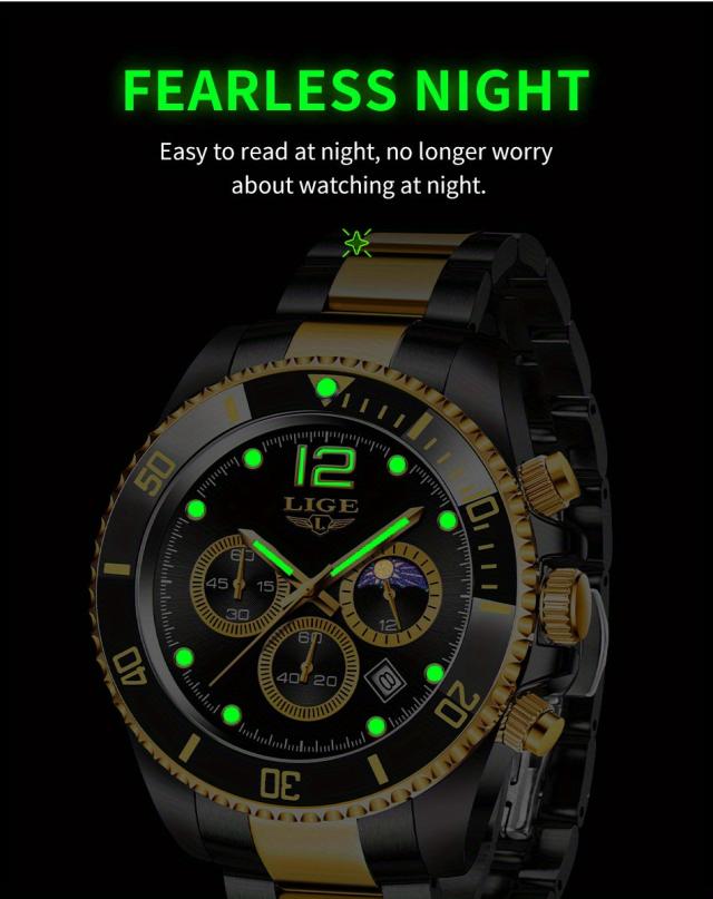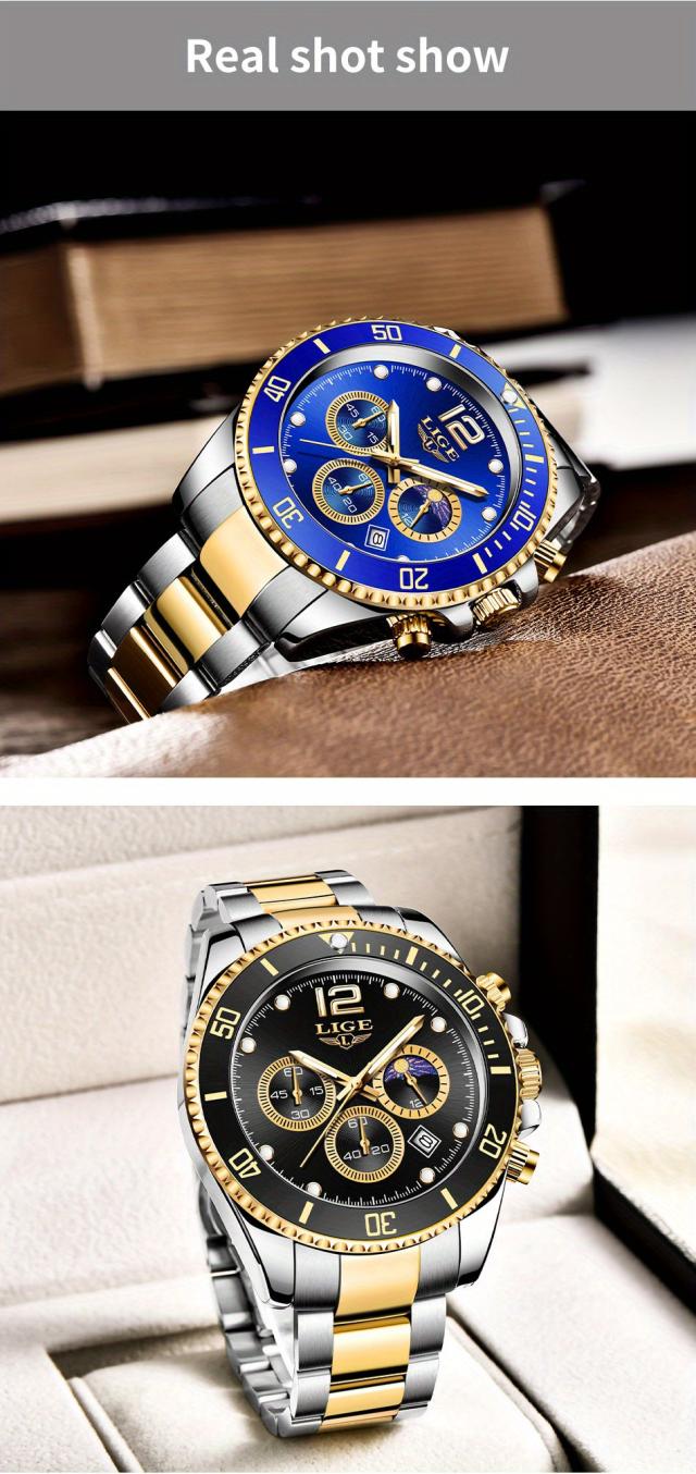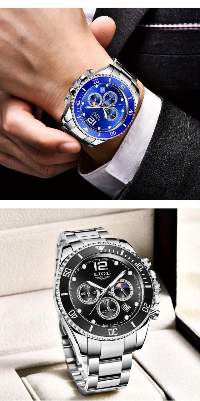 LIGE メンズ腕時計 1個 カジュアルステンレススチール ムーンフェイズウォッチ 男性用 スポーツ 防水 クォーツ クロノグラフ ギフトに最適