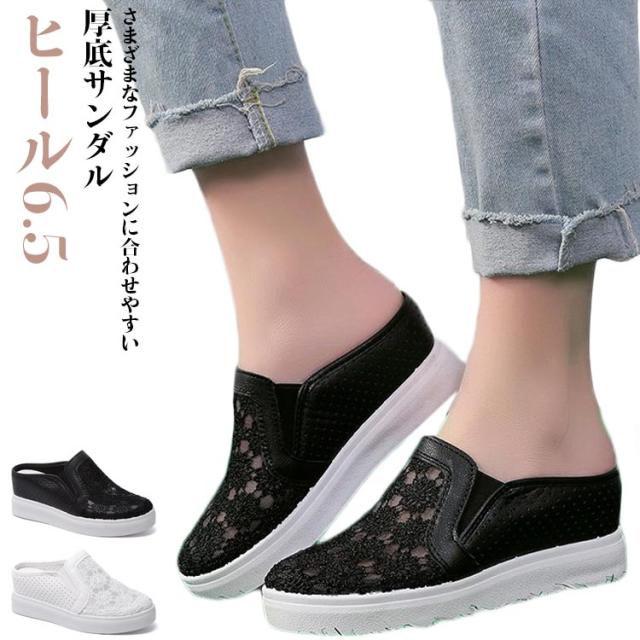 ウェッジソール ヒール6.5 ミュール 厚底 美脚 厚底サンダル サンダル ハイヒール 透かし編み かわいい 大人女性 ストーム ヒールサンダル サンダル メッシュ レディース 靴 女性 大人 歩きやすい 旅行 お洒落 シンプル