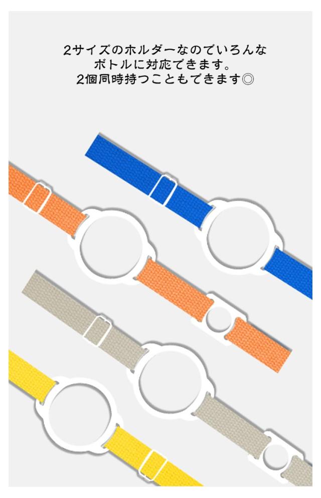| 【2本セット】【ボトルホルダー】【2個同時持つ】【全30色】 ショルダー型のおしゃれなペットボトルホルダー。 首から吊り下げたり、肩掛けにしての使用が可能です。 2サイズのホルダーなのでいろんなボトルに対応できます。2個同時持つこともできます◎ シリコンリングを広げて飲み口を引っ掛けるだけで様々なボトルをかけることができます。 肩紐は調節が可能なので、子供から大人まで幅広く使用することが可能です。 フェスや散歩、ウォーキングといった野外で楽しむイベントにぴったりのアイテムです。 豊富な30カラー、親子・お友達とお揃い、イベントの景品としても利用しやすいアイテムになっています。 | |