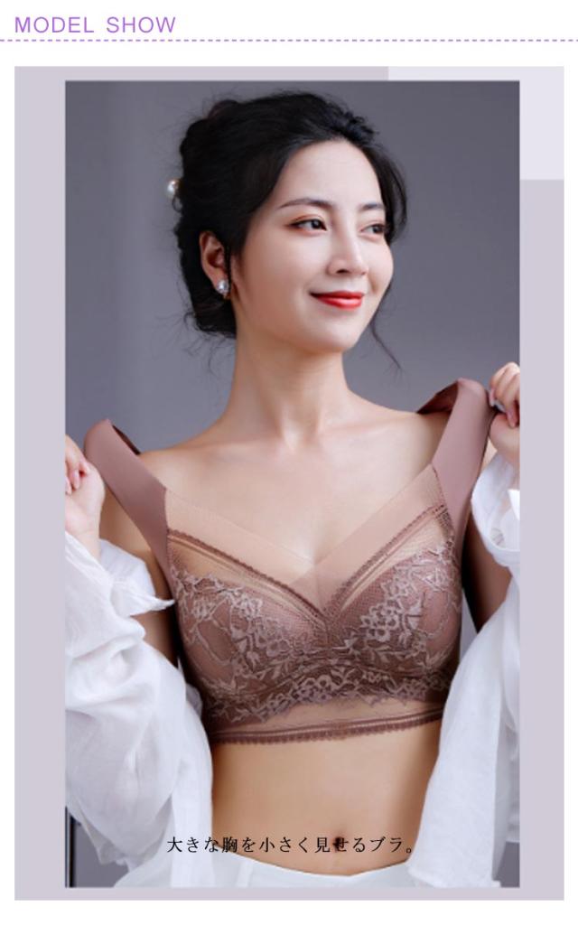 | かわいいレースデザイン!大きな胸を小さく見せるブラ。 やや薄手のカップで、ボリュームが出すぎないのも嬉しいポイント。 ノンワイヤーで窮屈感を軽減。 しっかり胸をつつんで綺麗なシルエットを作ります。 脇高仕様で脇のお肉をしっかりとおさえ、大きな胸のすっきり細見えを実現します。 ストラップも太目仕様なので、肩への食い込みも軽減されます。 特有のU字型バックストラップで背中をフラットに抑え、スッキリとした後ろ姿に。 | |