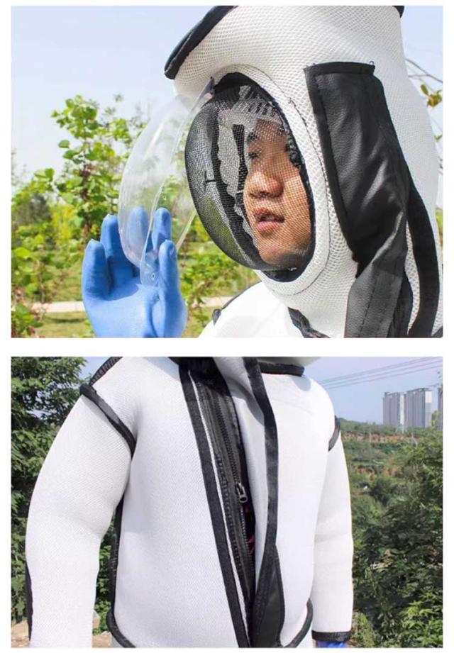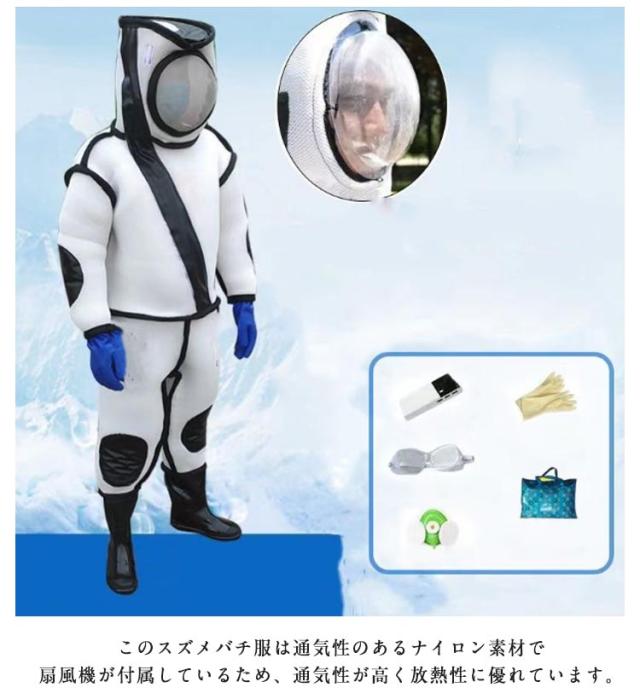 | 頭に一つファンがあり、突き出るフェイスマスクがしっかり顔を守ります。すずめ蜂から身を守る最強防護服です。高い防刺傷性能により蜂の攻撃から身を守る安全構造。 軽量で機能性に優れ、着脱が容易なつなぎ服。 着心地の良い、柔らかで通気性のある、優れた布を採用します。 肥厚した布は、ハチの咬傷からよりよく保護することができる。 軽くて蒸れにくい作りで、超軽量で着心地が良く、自由自在に作業できます。 このスズメバチ服は通気性のあるナイロン素材で扇風機が付属しているため、通気性が高く放熱性に優れています。 | |