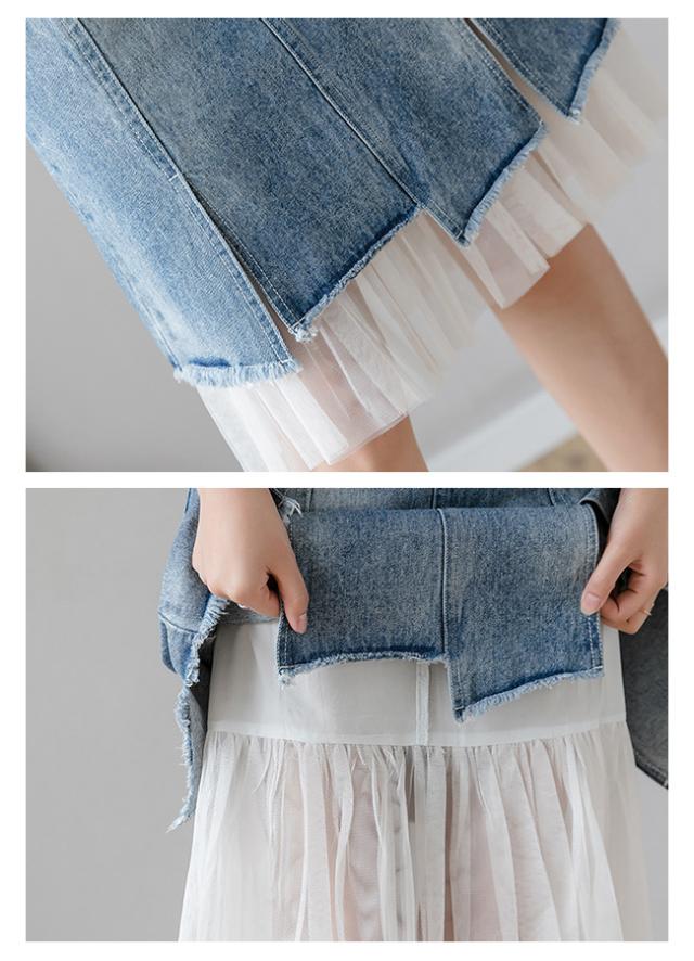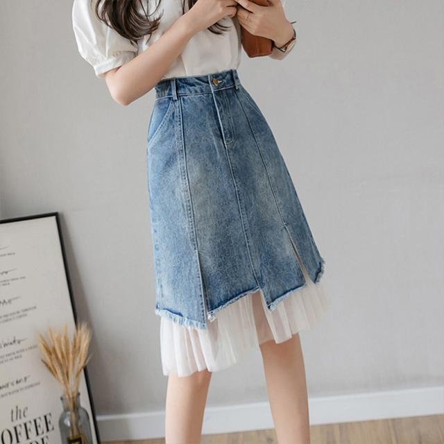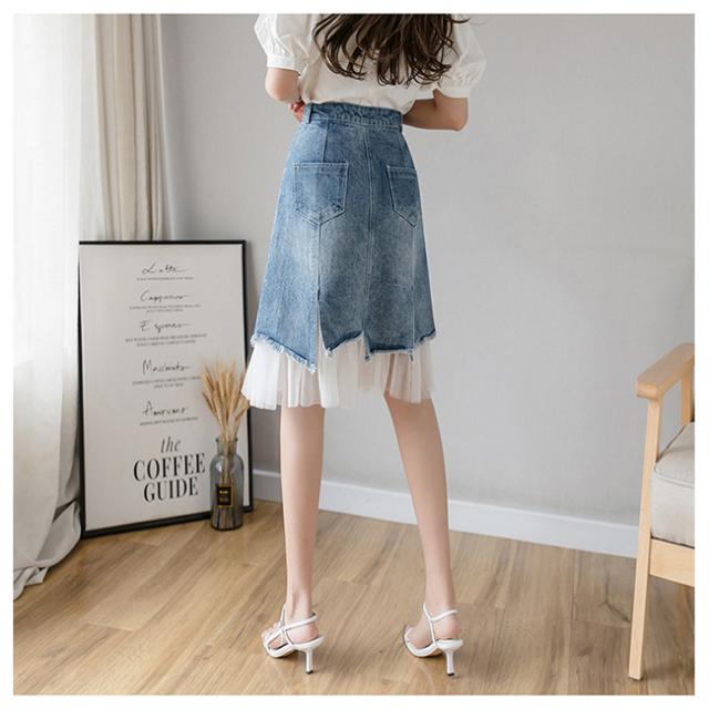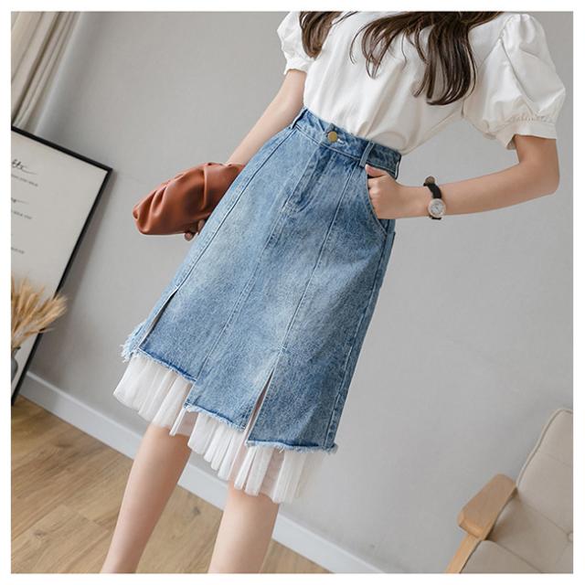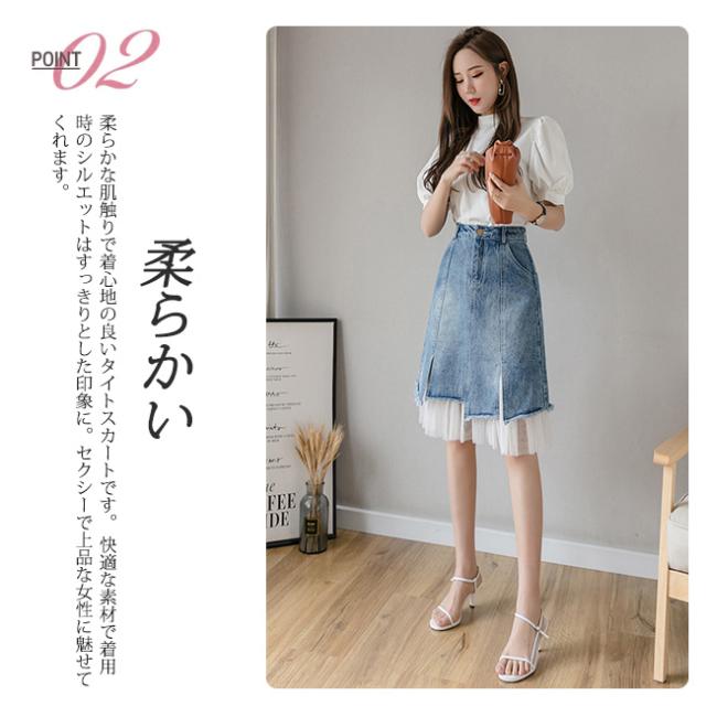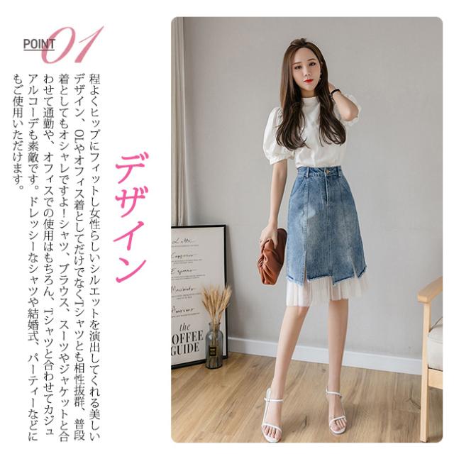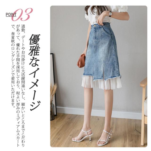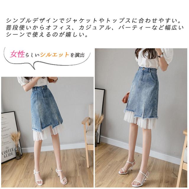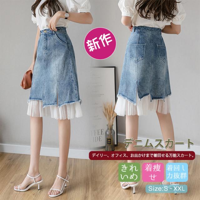 デニムスカート レディース ひざ丈 ハイウェストスカート レース 切り替えジーンズ レディース シンプル Aライン チュールスカート タイトスカート ストレート レーススカート 大きいサイズ シルエット