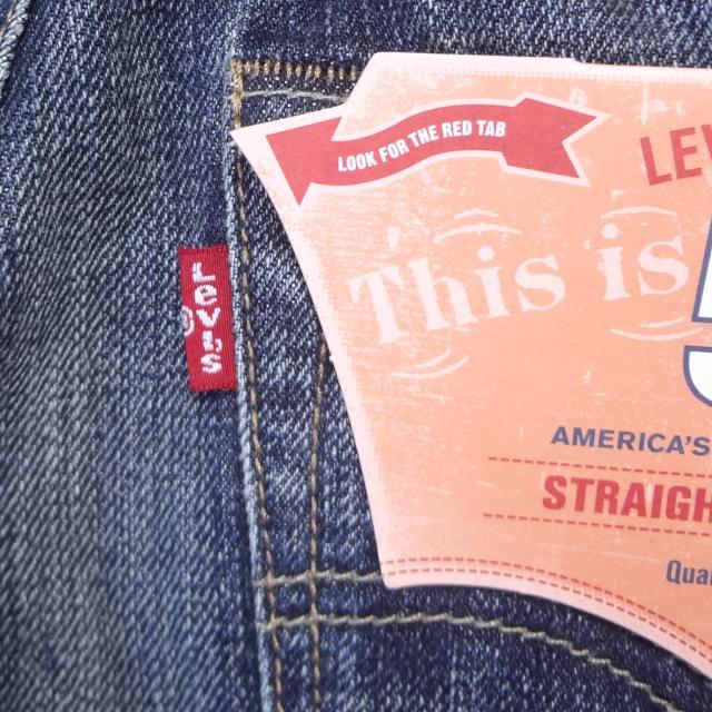 ・スモールeレッドタブ、ボタンフライ、V字ステッチ補強、アーキュエットステッチ、5ポケットリベット、レザーパッチ