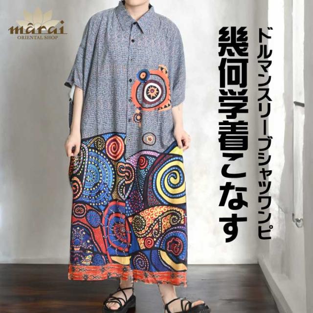 ワンピース レディース シャツワンピ 幾何学着こなす。アートプリントドルマンスリーブシャツワンピ rd61070 夏 夏服 柄物 ドルマンスリーブ オーバーサイズ ゆったり 半袖 五分袖 総柄ワンピース 派手 個性的 大人 カジュアル エスニック アジアン