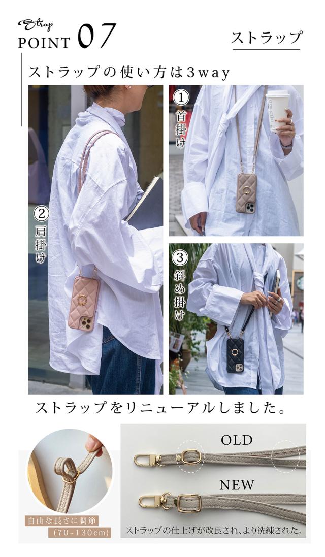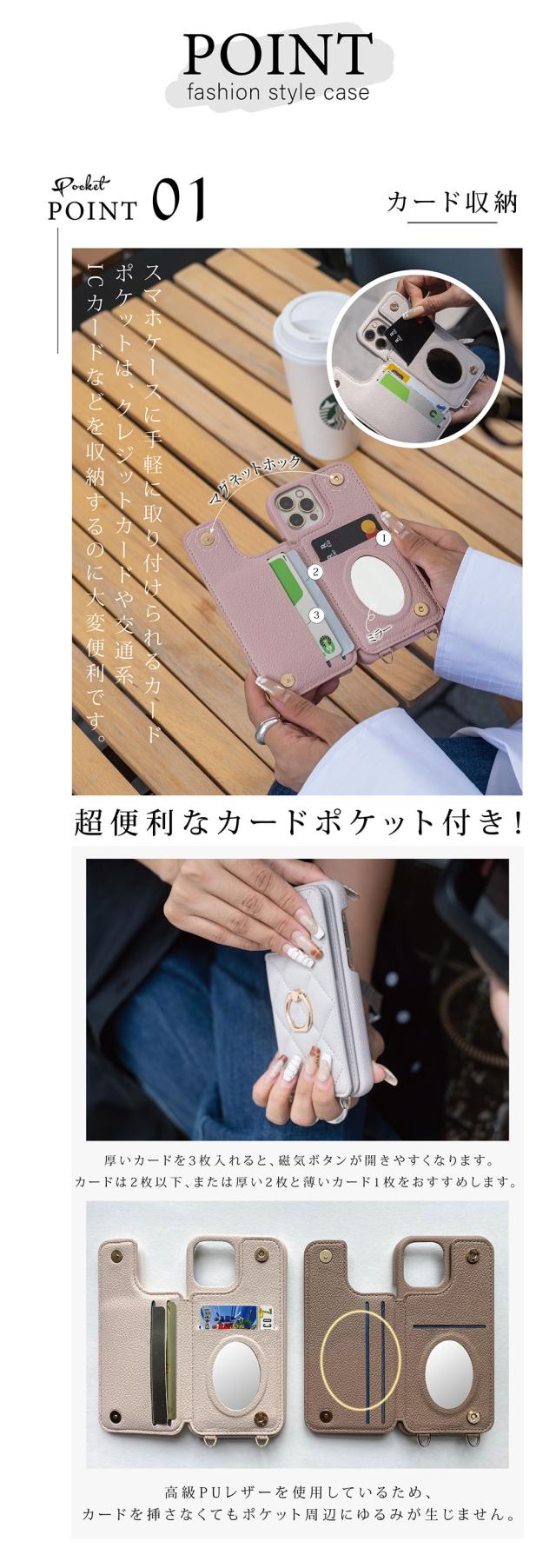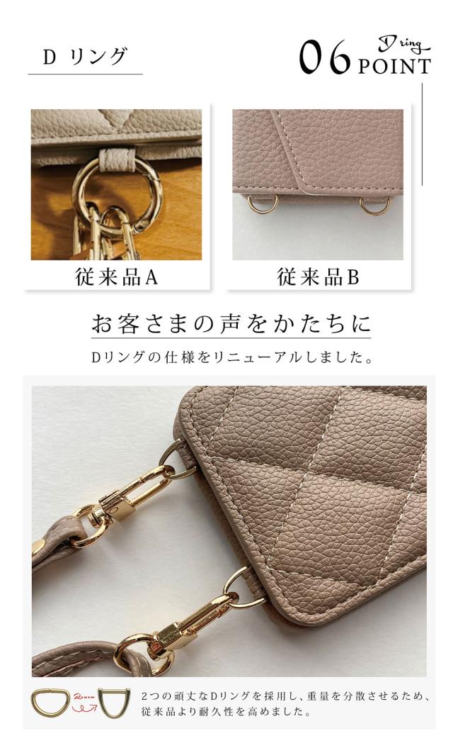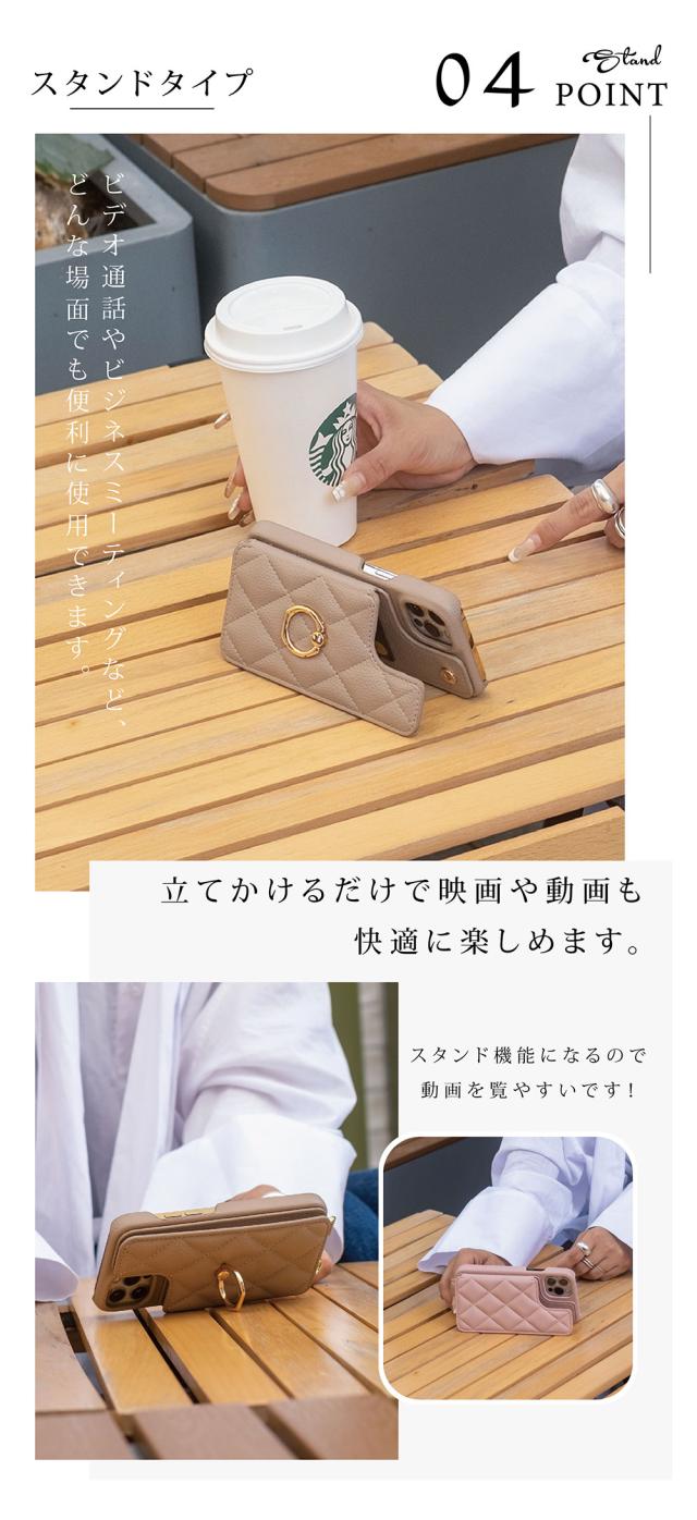 - カラーはエクリュを購入しましたが 思ったよりピンクよりでした 写真では白っぽい感じだったので 赤のiPhoneとは合わなかったです キルティング感は問題なし。 在庫がリングつきしかなくリングつきを購入...