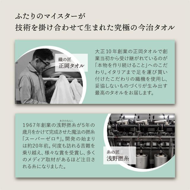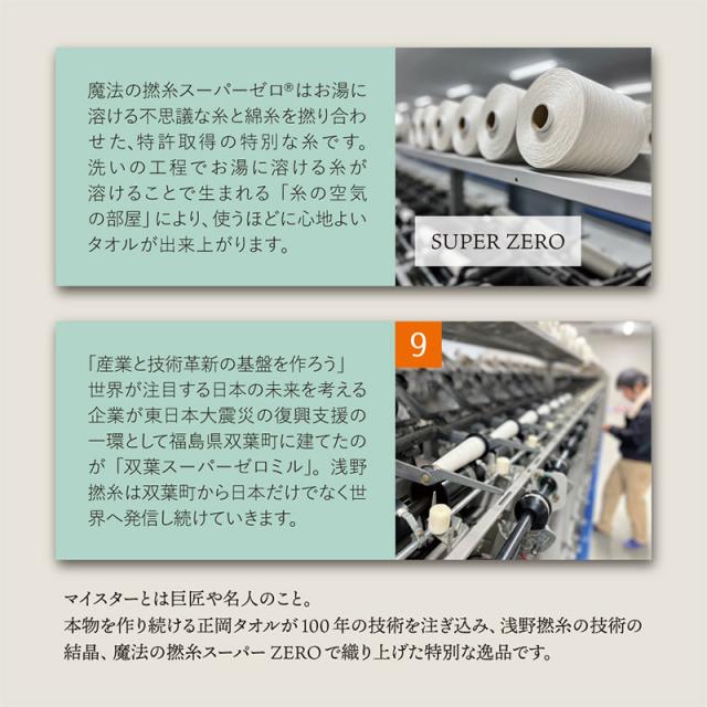 世界が注目する魔法の撚糸「スーパーZERO(R)」に100年の技術を注ぎ込み織り上げた、心地よさが長続きする魔法のようなタオルです。