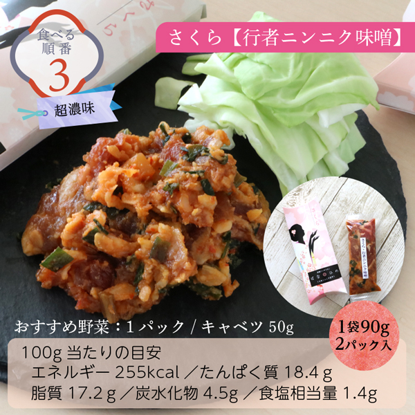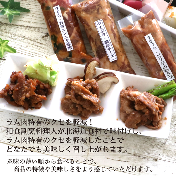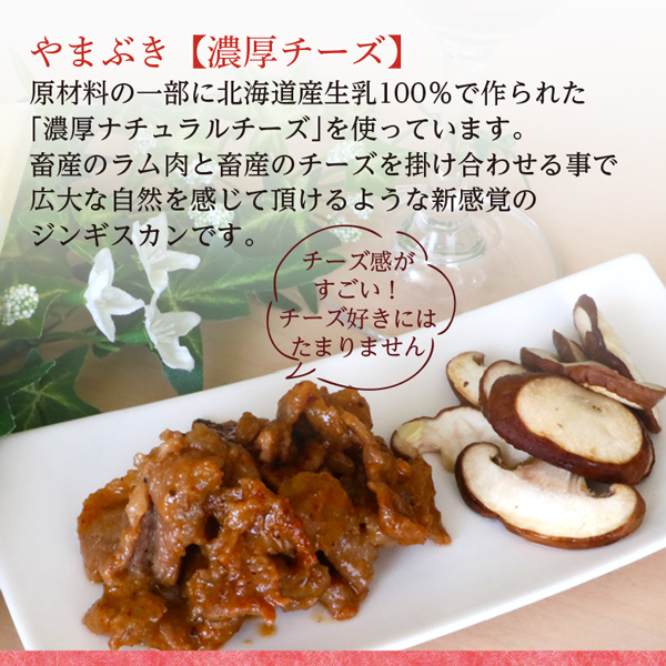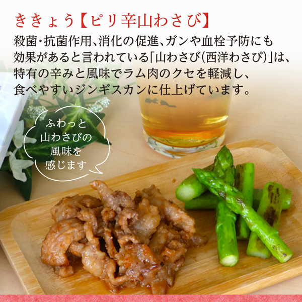 原材料名 :さくら 行者ニンニク味噌:ラム(オーストラリア)、白みそ、赤みそ、本みりん、料理酒、砂糖、行者ニンニク、ニラ、フライドガーリック、おろししょうが、おろしにんにく、豆板醤/アルコール、酸味料、(一部に小麦・大豆を含む) やまぶき 濃厚チーズ:ラム(オーストラリア)、ナチュラルチーズ、こいくちしょうゆ(本醸造)、砂糖、本みりん、洋梨シロップ漬け、たまねぎ、料理酒、昆布だし(昆布エキス、食塩、かつお節エキス、真昆布、根昆布)、ジンギスカンタレ(しょうゆ、てん菜糖蜜、砂糖、その他)、トマトケチャップ、レモン風味ジュース(果糖・ブドウ糖液糖)、白みそ、ごま油、おろししょうが、おろしにんにく、青唐辛子ソース(食酢、ハラペーニョペパー、食塩、コーンスターチ)、いりごま、香辛料/アルコール、調味料(アミノ酸等)、酸味料、増粘多糖類、塩化Ca、着色料(カラメル、黄4)、香辛料抽出物、香料、安定剤(キサンタンガム)、(一部に乳成分・小麦・大豆・ごまを含む) ききょう ピリ辛山わさび:ラム(オーストラリア)、加工わさび(西洋わさび、植物油脂)、こいくちしょうゆ(本醸造)、砂糖、本みりん、洋梨シロップ漬け、たまねぎ、料理酒、昆布だし(昆布エキス、食塩、かつお節エキス、真昆布、根昆布)、ジンギスカンタレ(しょうゆ、てん菜糖蜜、砂糖、その他)、トマトケチャップ、レモン風味ジュース(果糖・ブドウ糖液糖)、白みそ、ごま油、おろししょうが、おろしにんにく、青唐辛子ソース(食酢、ハラペーニョペパー、食塩、コーンスターチ)、いりごま/アルコール、調味料(アミノ酸等)、ビタミンC、香辛料抽出物、酸味料、増粘多糖類、塩化Ca、着色料(カラメル、黄4)、香料、安定剤(キサンタンガム)、(一部に乳成分・小麦・大豆・ごまを含む)