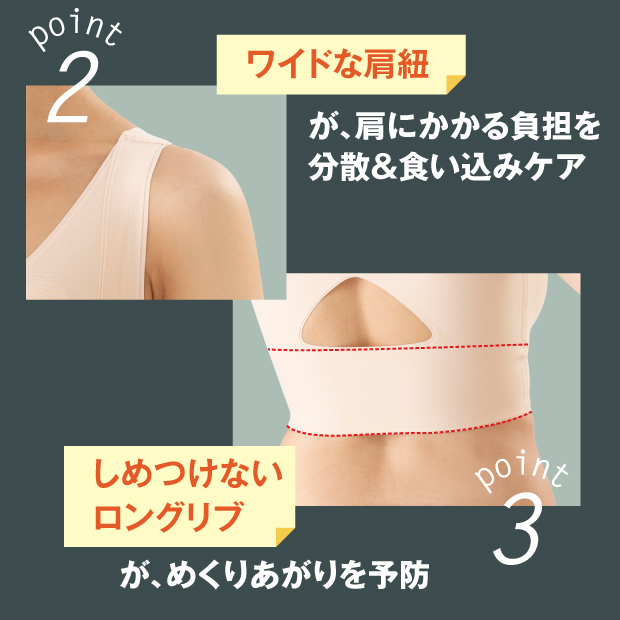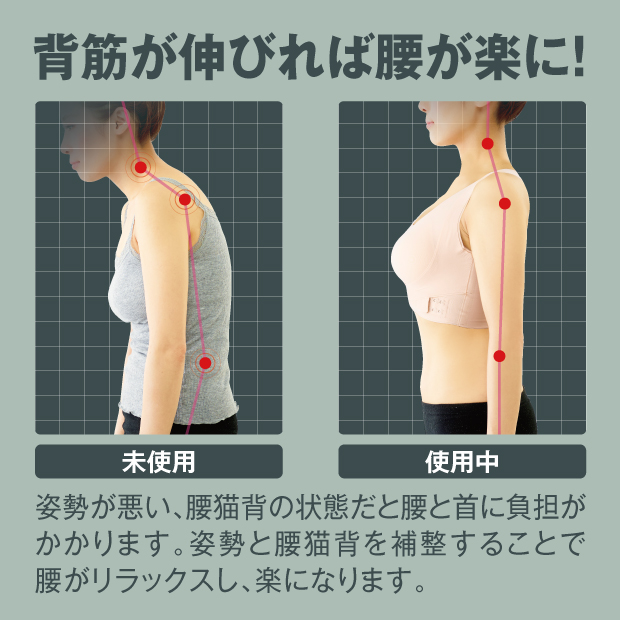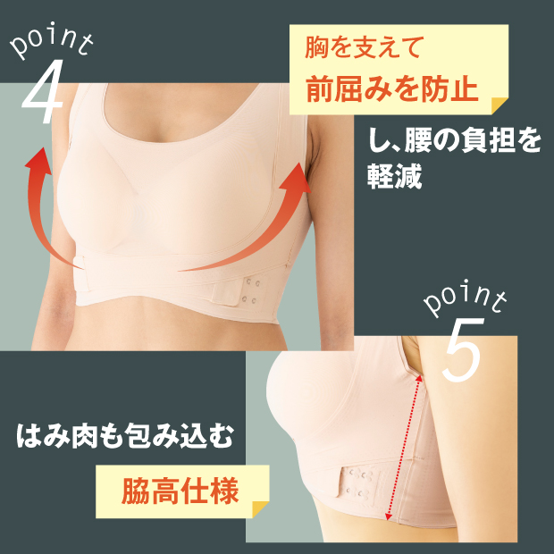 腰らくブラがノンワイヤー仕様にてリニューアルいたしました。ノンワイヤーで長時間付けていても気にならない。ワイヤーでバストを締め付けない為、長時間の着用でも疲れにくく、体への負担も軽減し、楽に過ごすことができます。伸縮性のある素材をしており、ぴったりフィットします。【高機能な6つのポイント】(1)骨格に沿った「たすき掛け」構造で丸まった背中を前に押し出し背筋をシャキッと伸ばします。(2)太めの肩紐が方にかかる負担を分散し、食い込みをケアします。(3)幅広リブがめくりあがりを予防します。(4)胸を支えて前かがみを予防し、腰の負担を軽減します。(5)伸縮性のある素材でぴったりフィットします。(6)脇の気になるハミ肉も包み込む脇高仕様です。