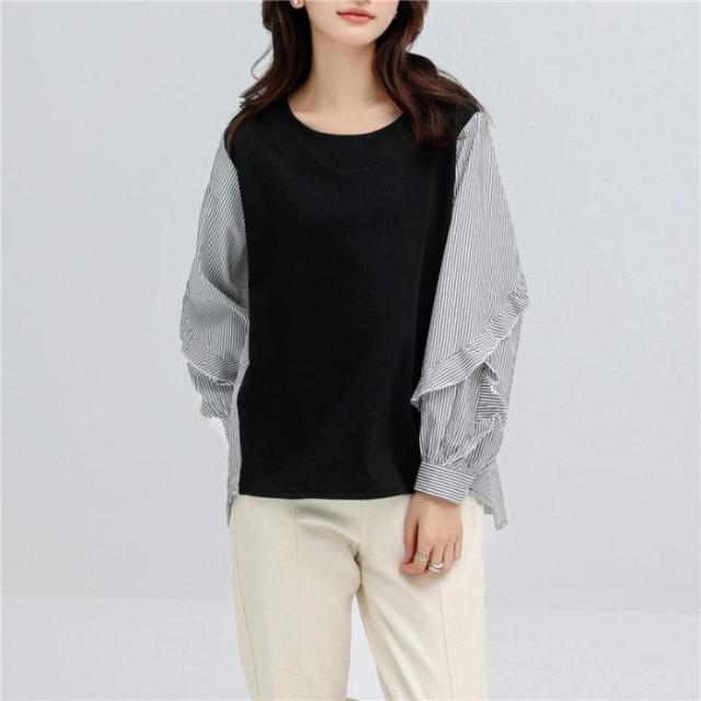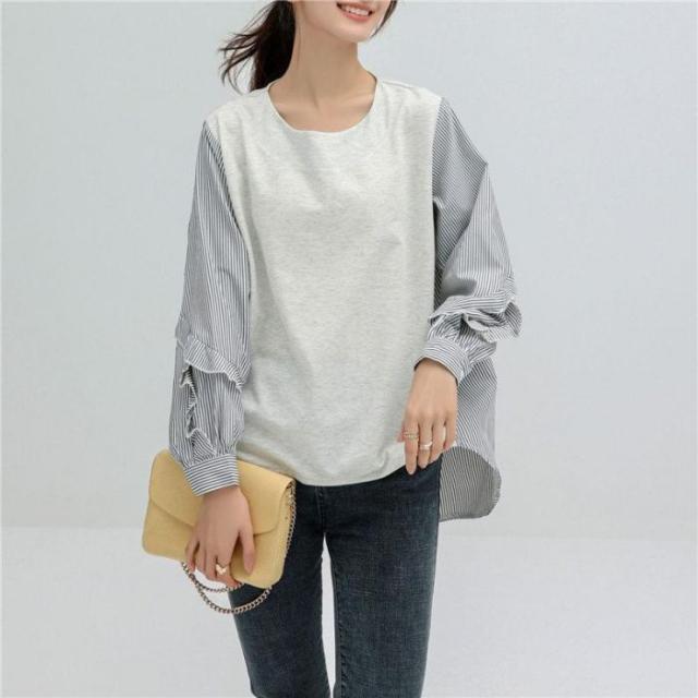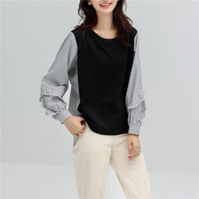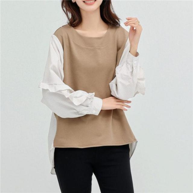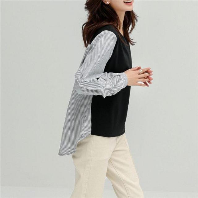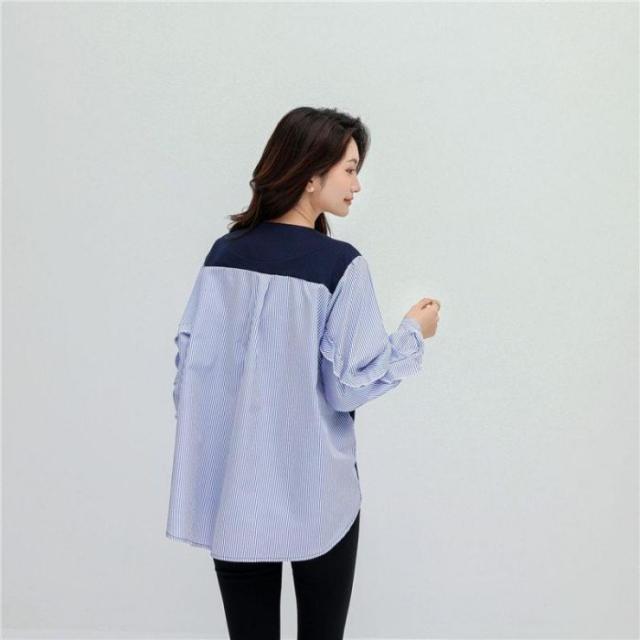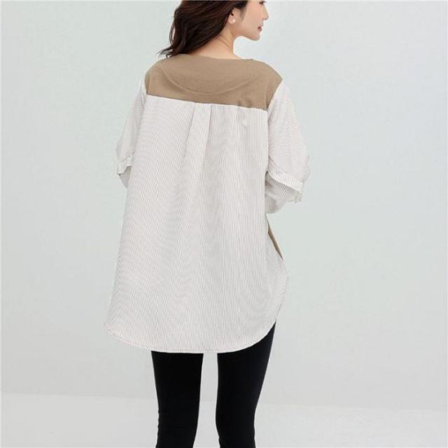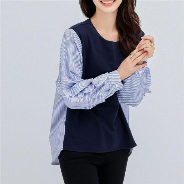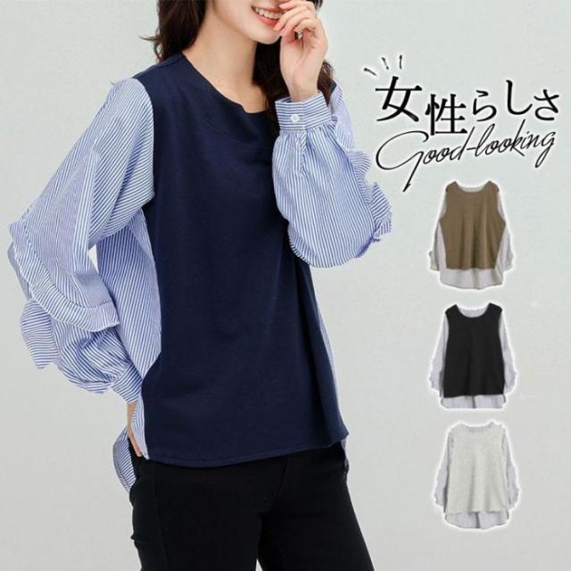 ブラウス シャツ レディース 長袖 ストライプ トップス パッチワーク きれいめ 通勤 ビジネス ゆったり 体型カバー オフィス カジュアル 可愛い