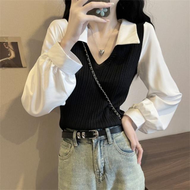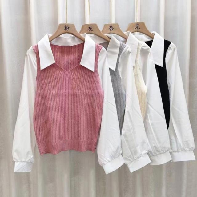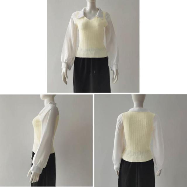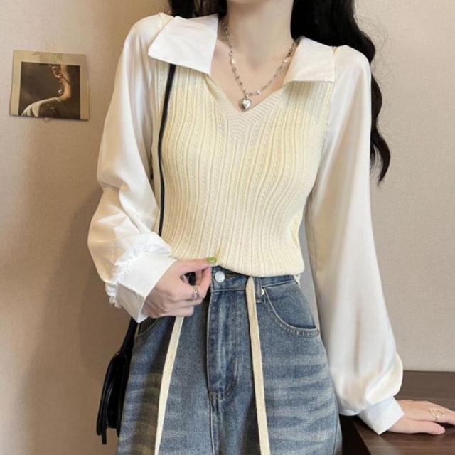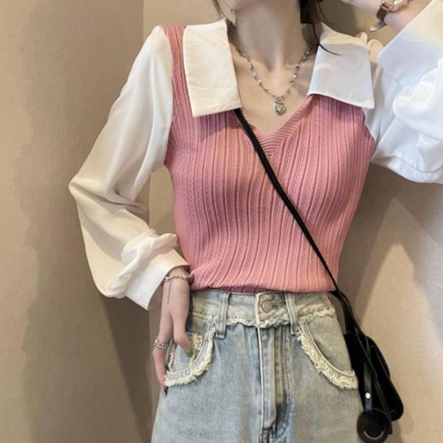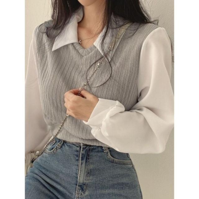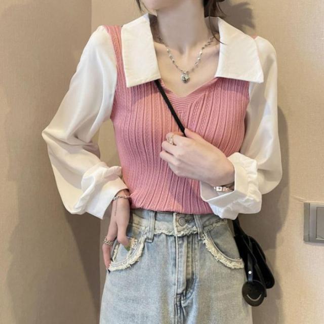 ニットブラウス韓国ドッキングニットシャツ