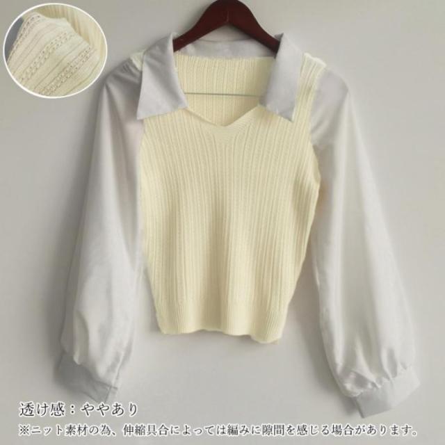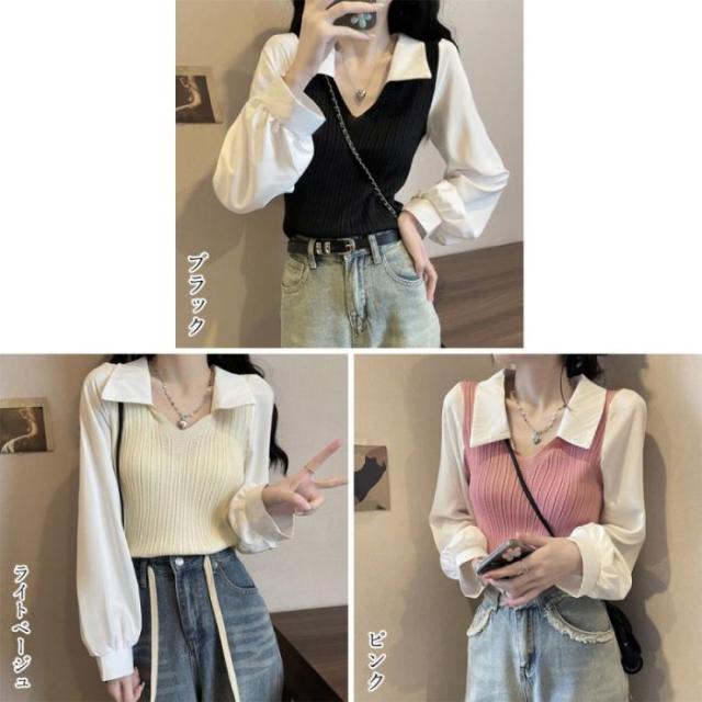 ニットトップス Vネック レディース リブニット 襟付き 異素材切替 ニットソー 着やせ重ね着風ニットトップス秋服