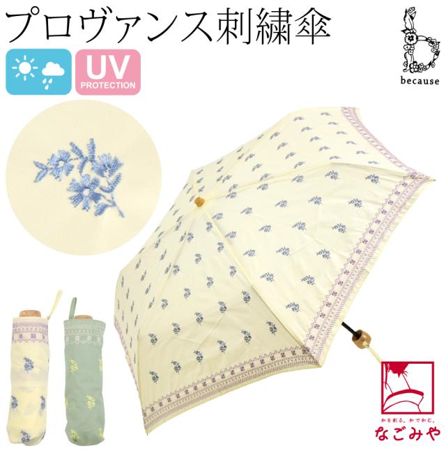 晴雨兼用 日傘 雨傘 通年用 because 折りたたみ傘 プロヴァンス刺繍 ミニ 暑さ 熱中症 日焼け 紫外線 UV 対策 撥水 防水 おしゃれ 大人 レディース 女性10024076
