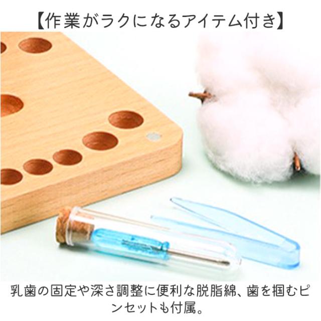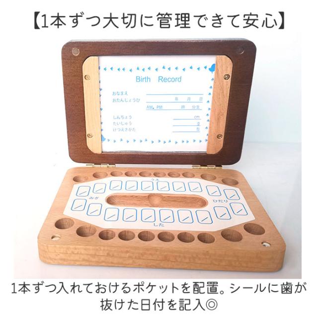 | 商品説明 | 【お子さまの成長の証をしっかり保管】 ・20本の歯を保管できる!シンプルな「乳歯ケース」が登場。 【ワンタッチでスムーズに開閉】 ・開口部にはマグネットを内蔵。パカッと開いてしっかり閉まるので、中身のこぼれ落ちをガード。 【1本ずつ大切に管理できて安心】 ・1本ずつ入れておけるポケットを配置。シールに歯が抜けた日付を記入◎ 【写真とロフィールと共に♪】 ・表面にお子さまの写真、内側に出生記録や血液型を記入したシートを入れることが可能。 (※)付属のドライバーで着脱できます。 【作業がラクになるアイテム付き】 ・乳歯の固定や深さ調整に便利な脱脂綿、歯を掴むピンセットも付属。 【ナチュラルな風合いがおしゃれ】 ・温かみのある木製ケース。お子様の成長の記録を、大切に残しておけるアイテム♪ |