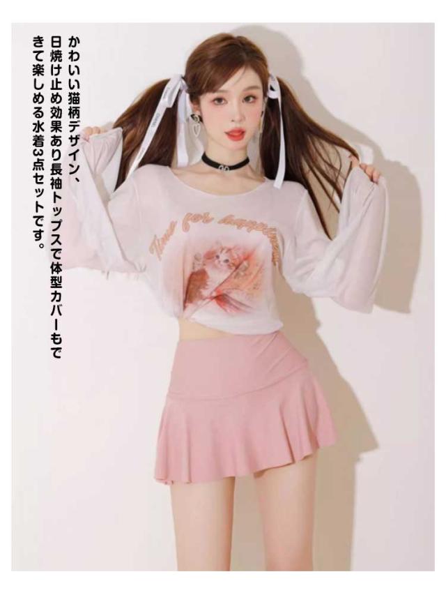 3点セット 猫柄 レディース 体型カバー 紫外線対策 体型カバー水着 タンキニ水着 パッド付き カップ付き ショートパンツ 10代 ワイヤー入り 体型カバー トップス 上下セット 20代 30代 かわいい S M 長袖