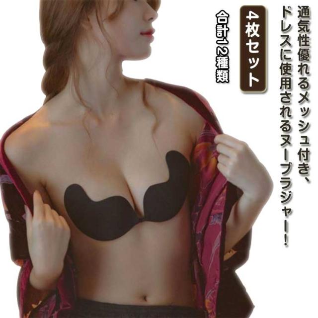 ヌーブラ ストラップレスブラ 盛れる ブライダルインナー 4枚セット ニップレス 紐なしブラ ブラ ブラトップ ドレス用 谷間メイク 下着 結婚式二次会 演奏会 ワンピース ヌーブラ A B C D 大きいサイズ フロントホック ブラック