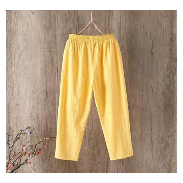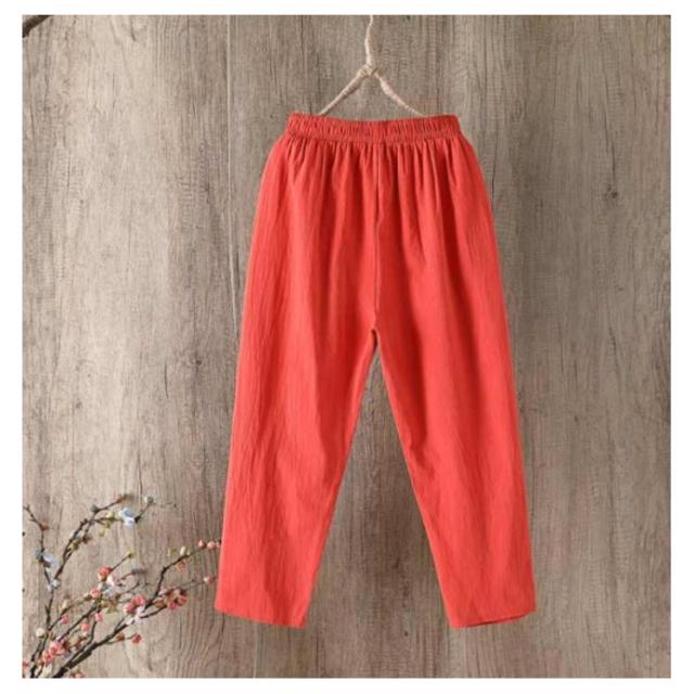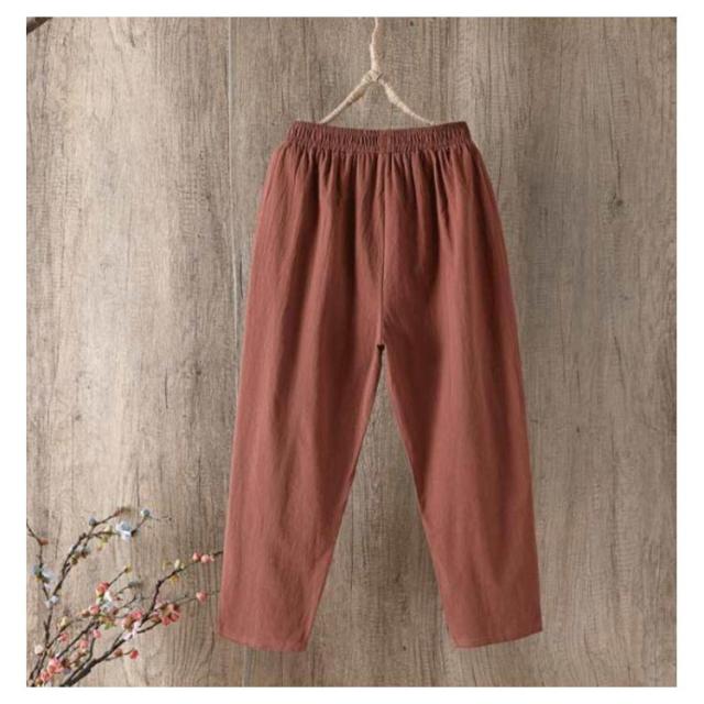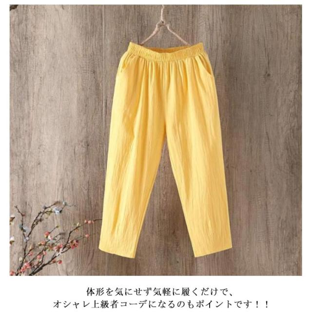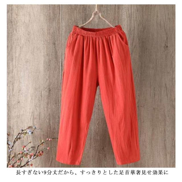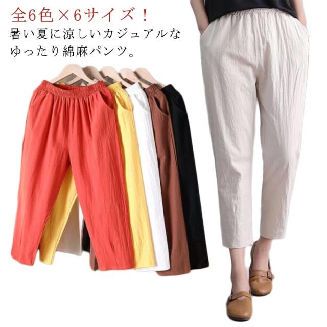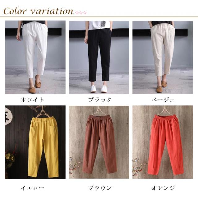 | 全6色×6サイズ!暑い夏に涼しいカジュアルなゆったり綿麻パンツ。 ナチュラルな綿麻素材は、さらりとした着心地で見た目も涼やかな風合いが魅力。 体形を気にせず気軽に履くだけで、オシャレ上級者コーデになるのもポイントです!! ウエストはゴム仕様に仕上げ、お腹周りの窮屈感を軽減してくれます。 長すぎない9分丈だから、すっきりとした足首華奢見せ効果に | |