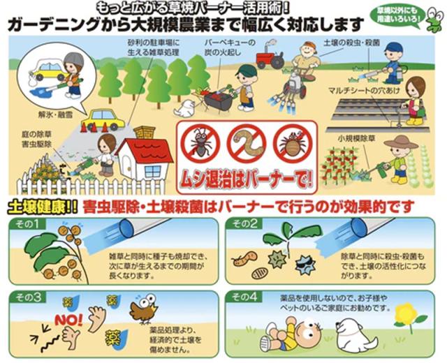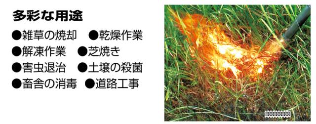 雑草の焼却、乾燥作業、解凍作業、芝焼き、害虫退治、土壌の殺菌、畜舎の消毒、道路工事など。