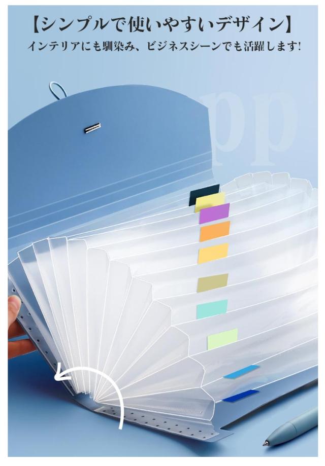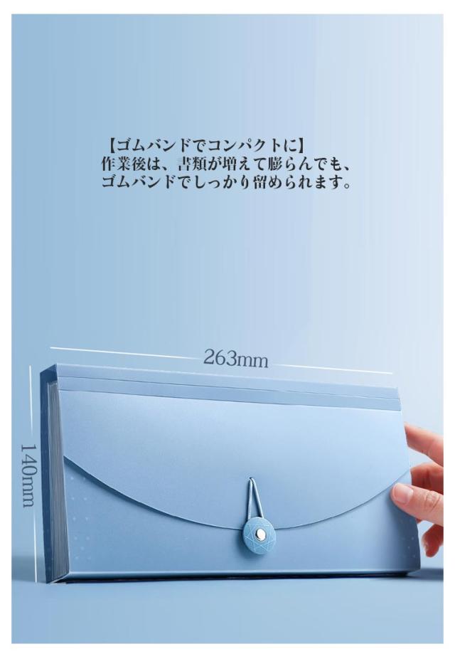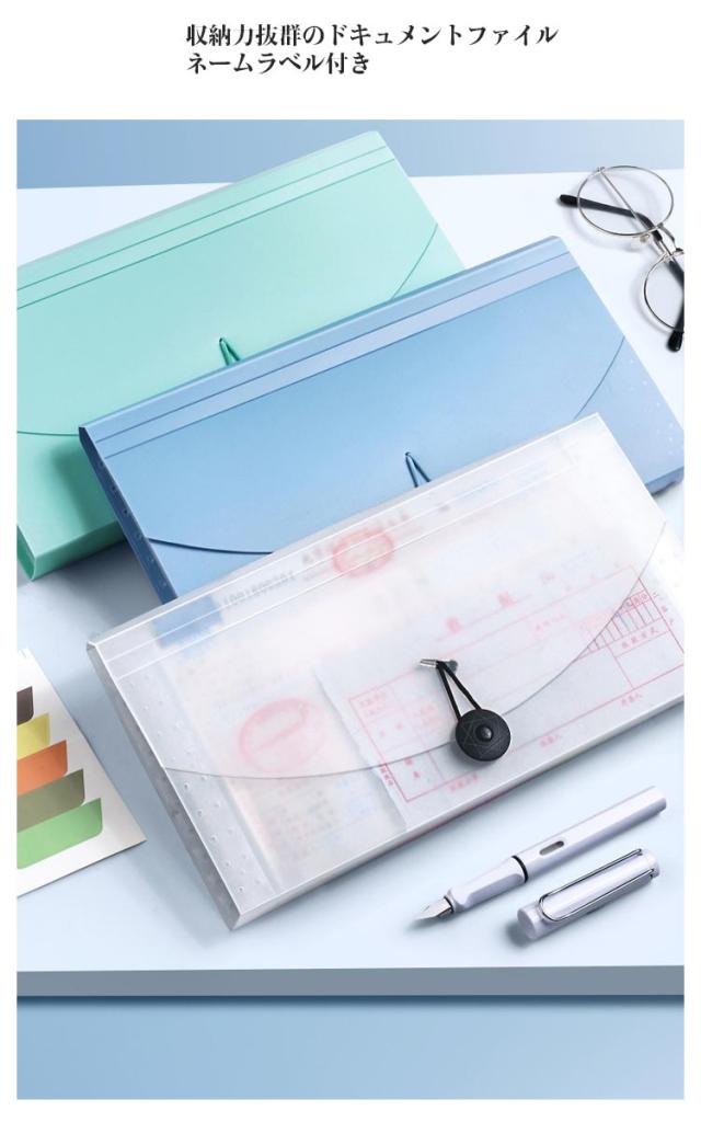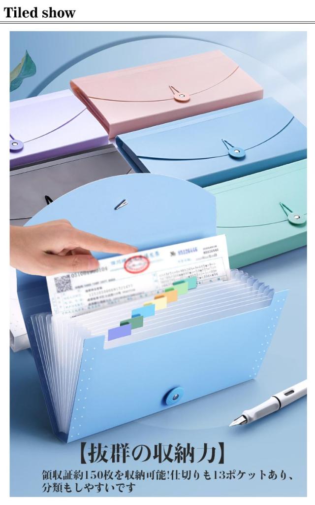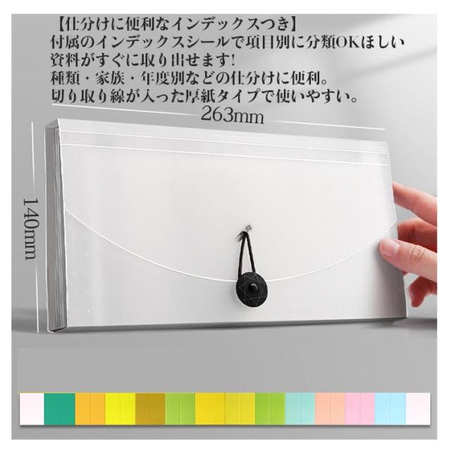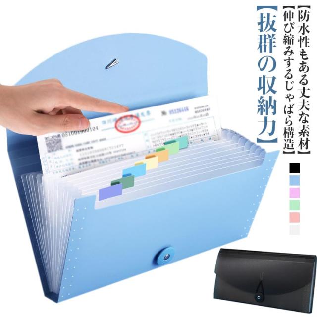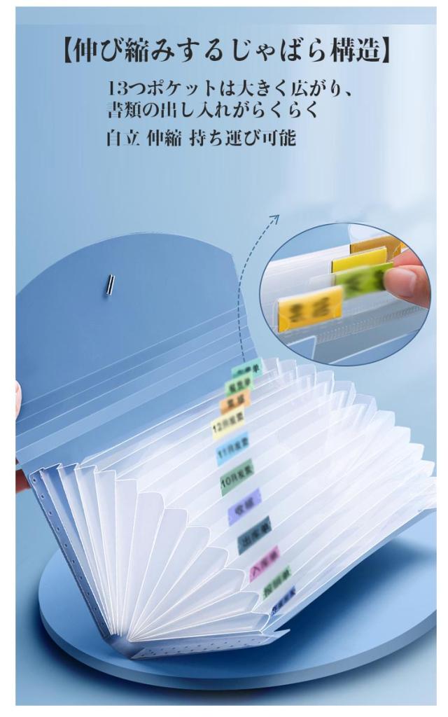 | 自立 伸縮 持ち運び可能 収納力抜群のドキュメントファイル ネームラベル付き 【抜群の収納力】 領収証約150枚を収納可能!仕切りも13ポケットあり、分類もしやすいです 【伸び縮みするじゃばら構造】 13つポケットは大きく広がり、書類の出し入れがらくらく 【仕分けに便利なインデックスつき】 付属のインデックスシールで項目別に分類OKほしい資料がすぐに取り出せます! 種類・家族・年度別などの仕分けに便利。切り取り線が入った厚紙タイプで使いやすい。 【防水性もある丈夫な素材】 表面には、水や汚れに強い丈夫なPP素材を採用。サッと拭けばすぐに綺麗をキープ。 【ゴムバンドでコンパクトに】 作業後は、書類が増えて膨らんでも、ゴムバンドでしっかり留められます。 【便利な持ち手つき】 持ちやすい取っ手つきで、持ち運びもラクラク! 【シンプルで使いやすいデザイン】 インテリアにも馴染み、ビジネスシーンでも活躍します! | |