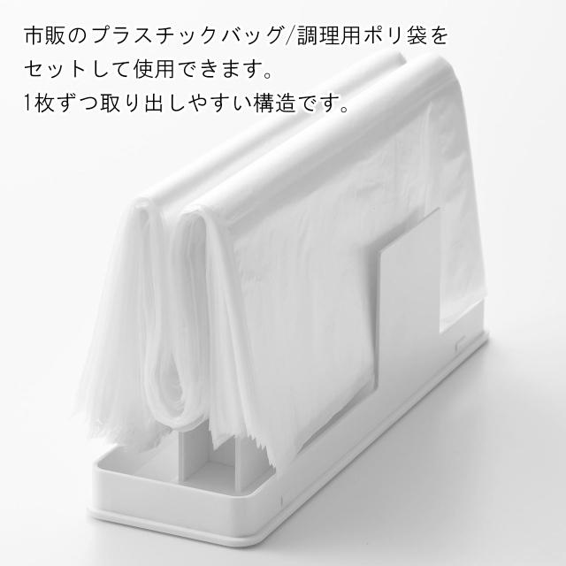 | 対応サイズ | W20〜22.5(マチ含まず)×H38cmまでのポリ袋を約200枚 ※マチ付き袋は、袋の幅(W)からマチの寸法を引いたサイズでご確認ください。※袋の厚みにより枚数は異なります。 |