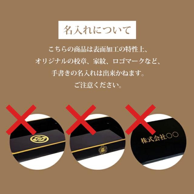 | 商品説明 | 紀州塗りの賞状盆です。 一般的なA3サイズの賞状用紙(42×29cm)が余裕をもって収まります。 賞状盆とは賞状やメダルを入れるお盆です。 卒業式、表彰式や入社式などの催事に欠かせない式典用品です。 表彰盆、黒盆とも呼ばれます。 素材はPC樹脂に乾漆Wコートの仕上げです。 細かい樹脂の粒に塗料を混ぜ合わせ現在風に作ったものを使用して一度目の塗装をしております。 これに再度カシュー塗装を施し表面強度が増しております。 これにより、キズに強く、取り扱いも簡単で気軽に使っていただけます。 ざらざらした表面が滑り止めにもなり、その独特の手触りが特徴です。 本体はほどよい重みがあり、マットな質感を感じられます。 当店では、お盆の縁の金縁付きまたは金縁無しをお選び頂けます。 特に決まりはございませんので、お好みでご利用のシーンにあわせてお選びください。 |