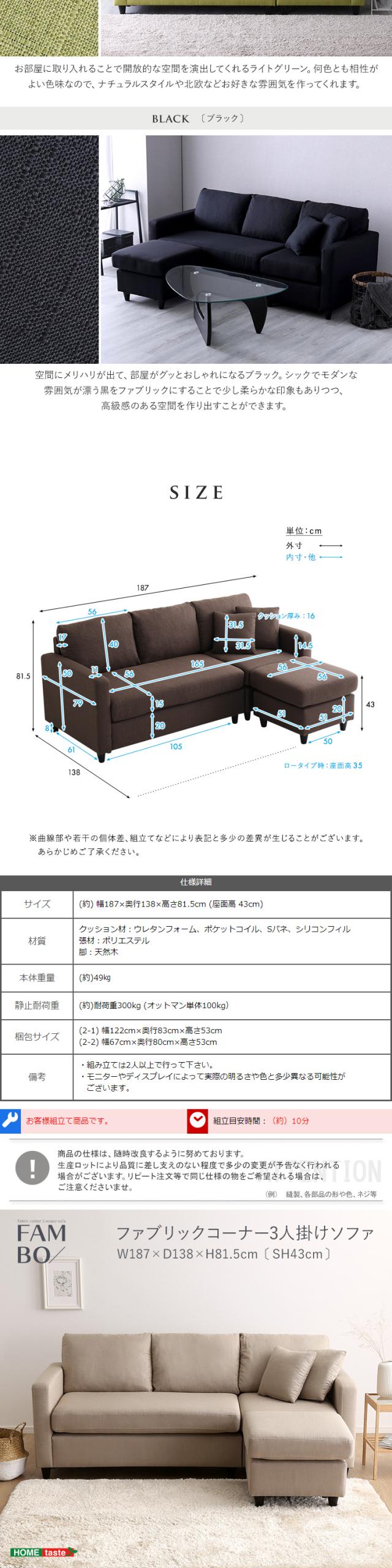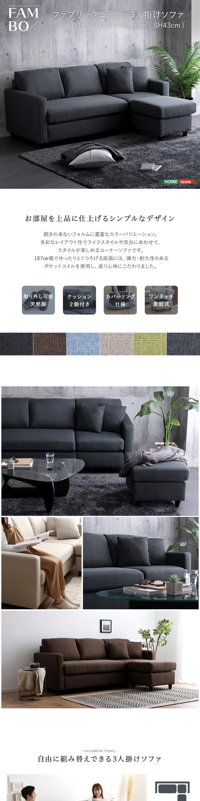お部屋の間取りに合わせてレイアウトを自由に変更できるファブリックコーナー3人掛けソファ。