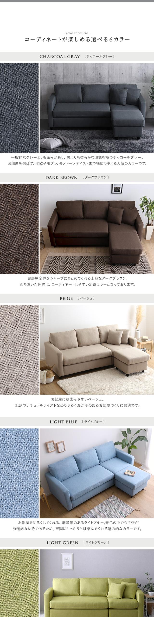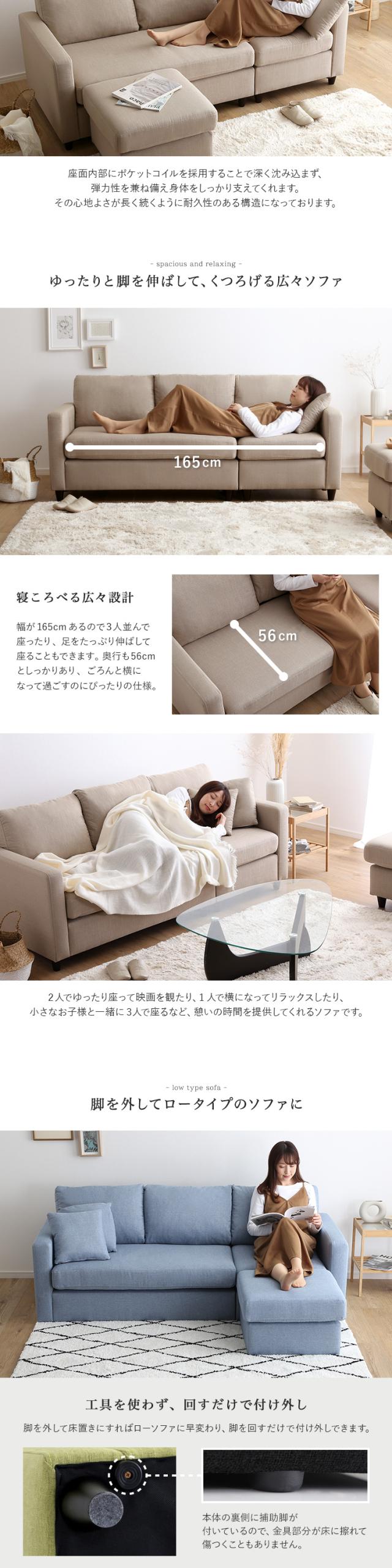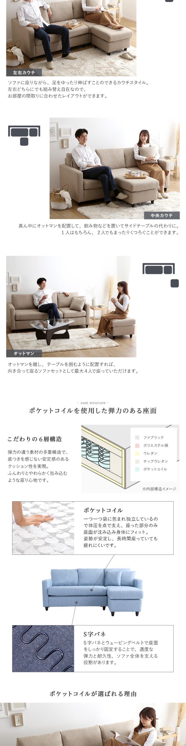 コーナーソファ 3人掛け クッション2個付 ポケットコイル カウチ オットマン付き シェーズロング ライトブルー色 全6色 カバーリング 布張り フロアソファにも