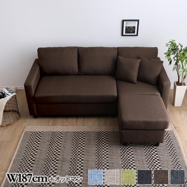 コーナーソファ 3人掛け クッション2個付 ポケットコイル カウチ オットマン付き シェーズロング ダークブラウン色 全6色 カバーリング 布張り フロアソファにも