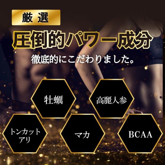 | 原材料 | 還元麦芽水飴(国内製造)、高麗人参末、亜鉛酵母、イチゴ果汁粉末、マカ粉末、アルギニン、牡蠣抽出物、トンカットアリ、クラチャイダム、ガラナ末、食用酵母、ムクナ粉末、アカガウクルア粉末、デキストリン、エゾウコギエキス末、アメリカ人参粉末、セレン含有酵母、韮種粉末、ウミヘビ粉末、マムシ粉末、冬虫夏草菌糸体末、ジンジャーエキス末、フィッシュコラーゲン、蟻粉末、スッポンエキス末、マカエキス末、タツノオトシゴエキス末/ビタミンC、ナイアシン、クエン酸第一鉄、香料、ビタミンE、パントテン酸カルシウム、BCAA(バリン/ロイシン/イソロイシン)、ステアリン酸Ca、酸化マグネシウム、ショ糖脂肪酸エステル、ビタミンB1、ビタミンB2、ビタミンB6、ビタミンA、葉酸、ビオチン、ビタミンD3、ビタミンB12、(一部にゼラチンを含む) |