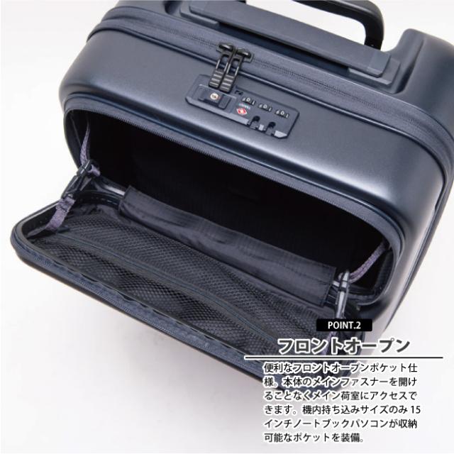 ボディには100% ポリカーボネートを使用し軽量性に特化したフロントオープン仕様のキャリーケースです。