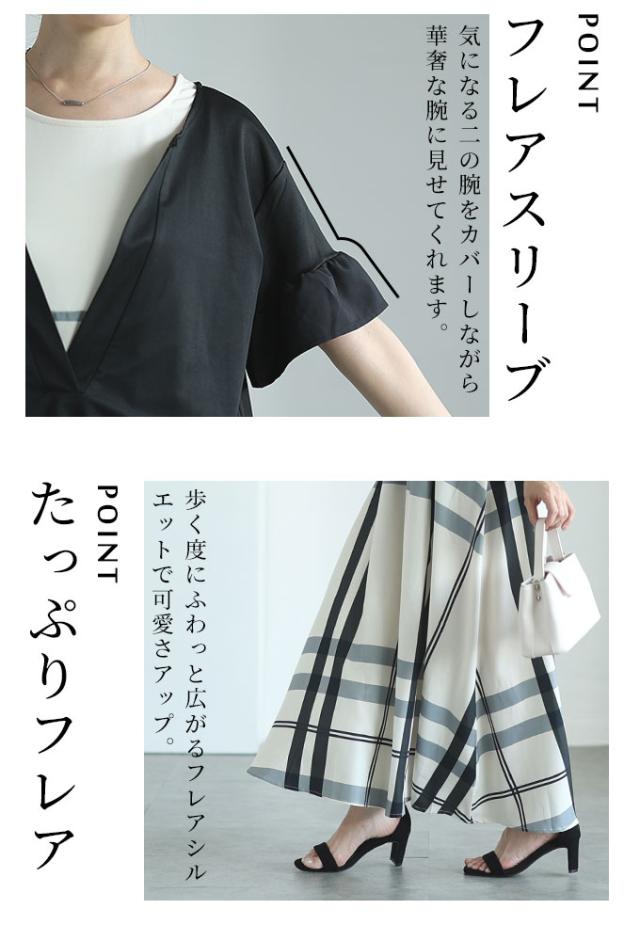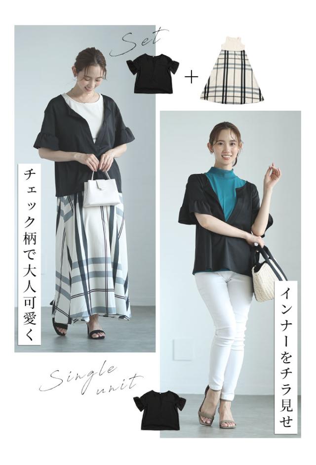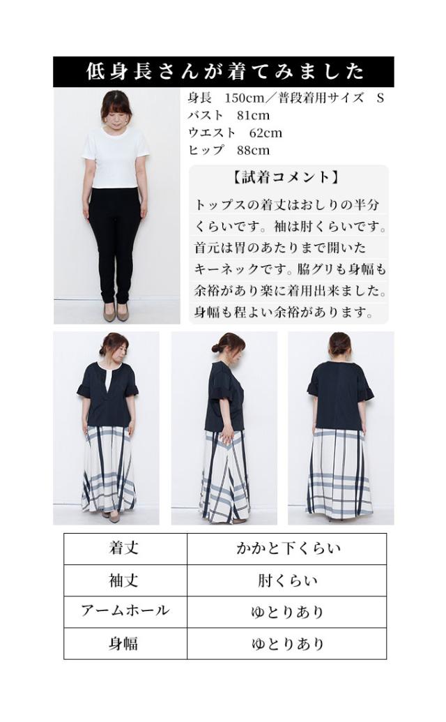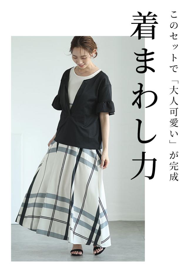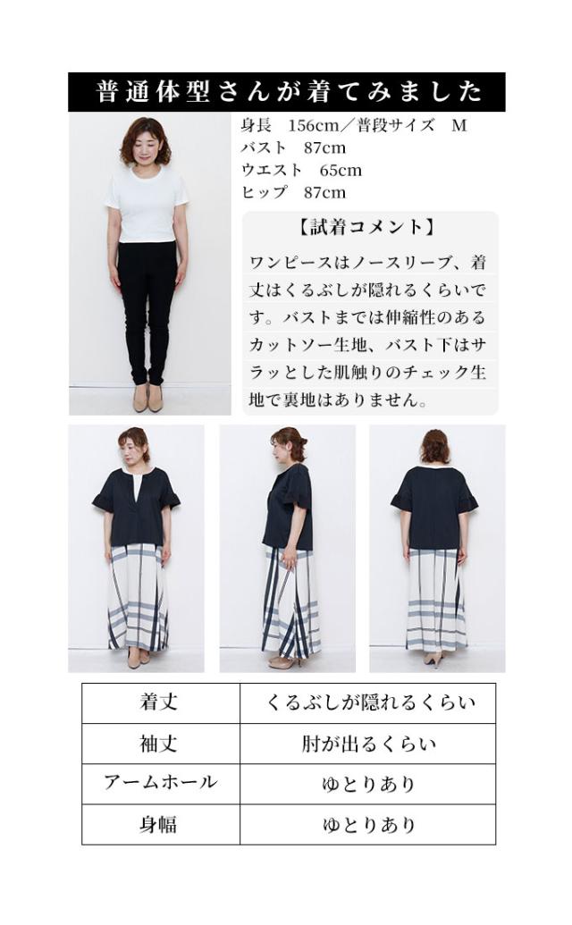 ワンピースはノースリーブ、着丈はくるぶしが隠れるくらいです。バストまでは伸縮性のあるカットソー生地、バスト下はサラッとした肌触りのチェック生地で裏地はありませんが透け感は気になりませんでした。トップスは着丈はヒップ半分隠れるくらい、袖は肘が出るくらいです。伸縮性がありゆとりあるサイズ感で、袖口はフリル仕立てで二の腕も気になりません。首元は胃のあたりまでの深いスリットが入っているのでスッキリ見えました。別々でも着回しが楽しめそうなセットアップです。