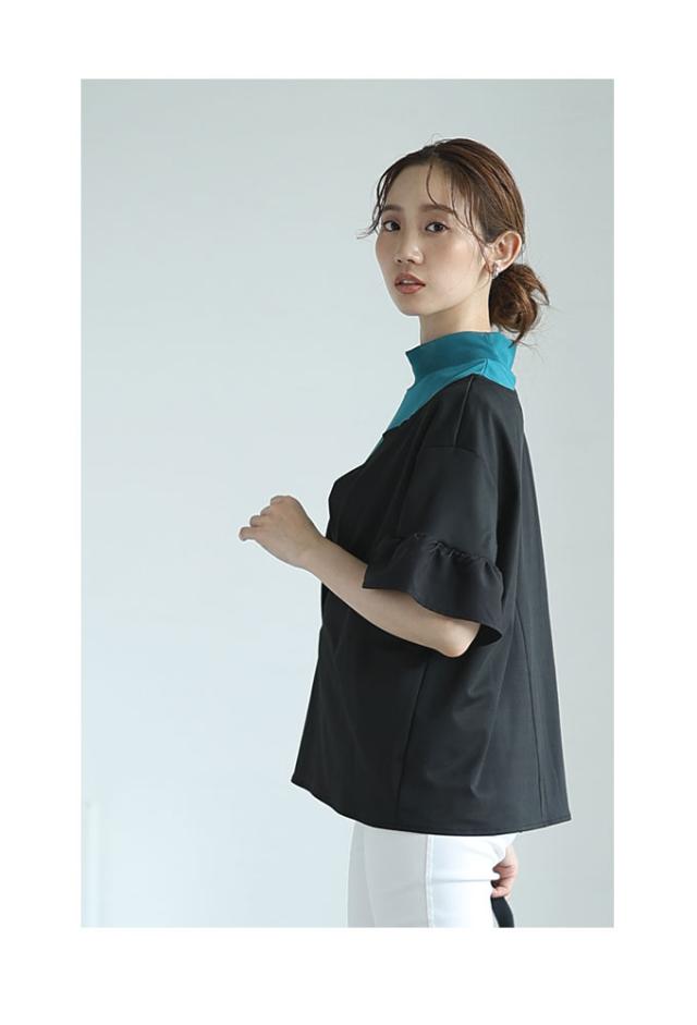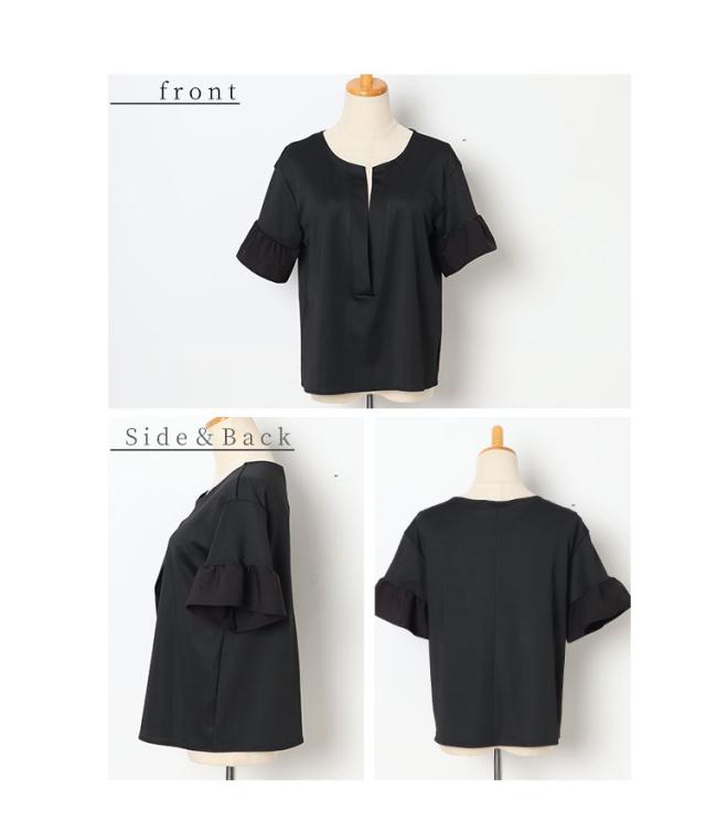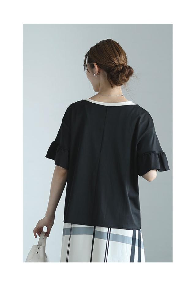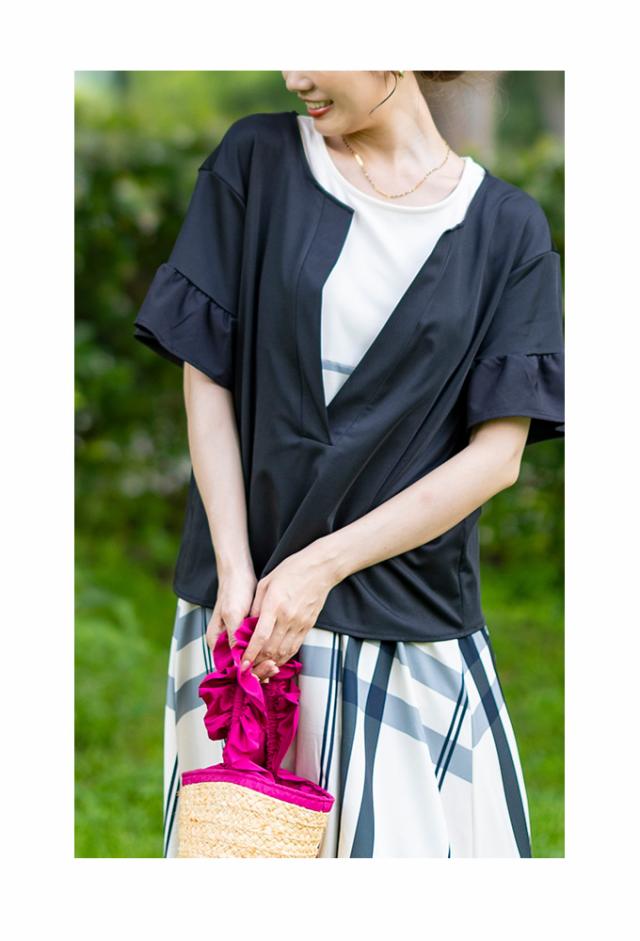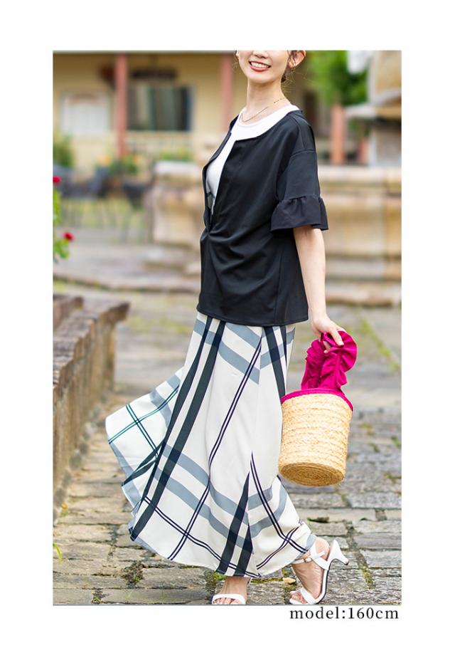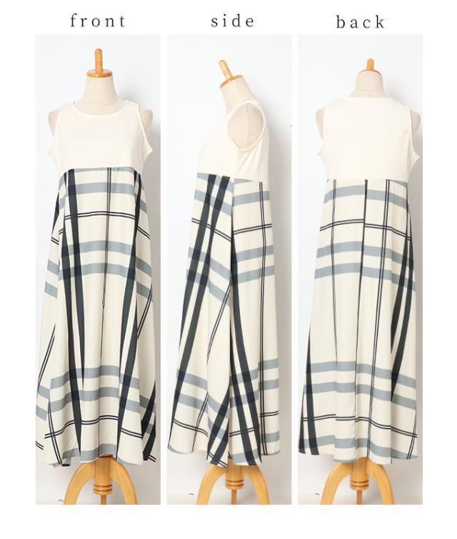 ワンピースはノースリーブ、着丈はくるぶしが隠れるくらいです。バストまでは伸縮性のあるカットソー生地、バスト下はサラッとした肌触りのチェック生地で裏地はありませんが透け感は気になりませんでした。トップスは着丈はヒップ半分隠れるくらい、袖は肘が出るくらいです。伸縮性がありゆとりあるサイズ感で、袖口はフリル仕立てで二の腕も気になりません。首元は胃のあたりまでの深いスリットが入っているのでスッキリ見えました。別々でも着回しが楽しめそうなセットアップです。