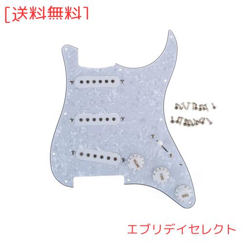 11ホール、4Ply SSSストラットスタイルのピックガード、米国/メキシコ標準ストラットに適合 セラミックマグネットシングルコイルピックアップセット ノブ、スイッチ、ピックアップ、プリワイヤ回路のフルセット カラー:パールホワイト パッケージに含まれるもの:1Pc搭載ピックガードセット