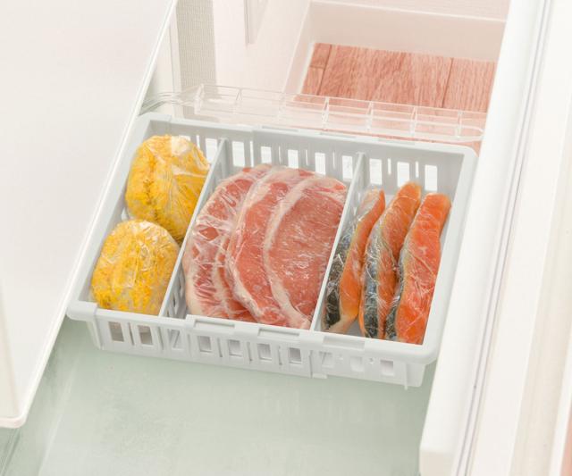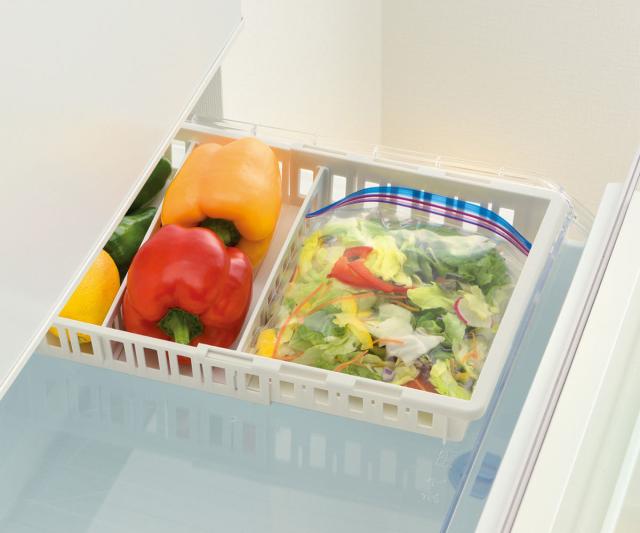 野菜室と冷凍室のスライドトレーにぴったりの浅型のレギュラーサイズです。残った野菜、冷蔵庫内で転がりがちなパプリカやレモン、お弁当用に小分けに冷凍したお肉や魚の収納にもおすすめです。