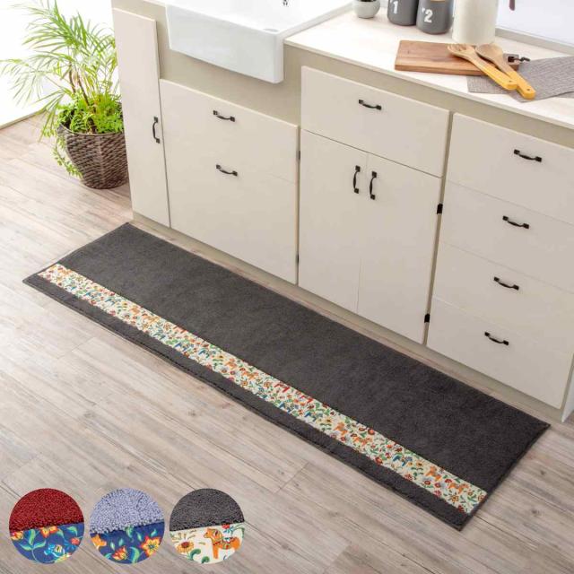 ●パイル生地と、綿のプリント生地のラインがアクセントになったダーラヘスト柄のキッチンマット50×180cmです。